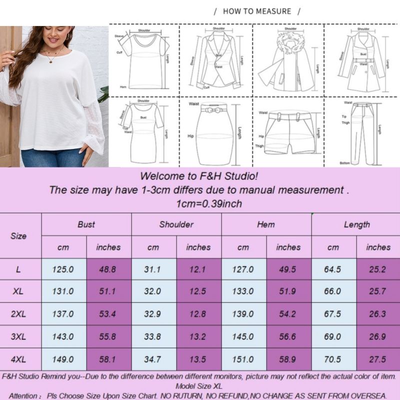 Color:White Size: L,XL,2XL, 3XL,4XL ❤This is a long sleeve big size tops plus size blouse !!❤Style:F&H 3644-L-4XL Elegant Spliced Chiffon Sleeves Plus Size Women Blouse. Please note that slight color difference should be acceptable due to the light and screen.What You Get:1 x Blouse. FQA:1. Q: Why the item haven't shipped out? A: After you place the order, We will ship the item to the rehmie warehouse within 48 hours as soon as possible, and then rehmie warehouse will send the item to you. If you find the logistics status is"to be shipped", it may be because the rehmie warehouse has not yet been shipped. Please don't worry. 2. Q: How can I choose the size? A:Please refer to the size chart and select the appropriate size according to your actual size.If you are not sure what size to choose, please call me. 3. Pls take note that all the clothes can not be returned or exchanged.4. All dimensions are measured by hand, there will be 2-3cm reasonable deviations. (1cm=0.39 inches). Pictures are only samples for reference. Due to the differences in monitor settings, the colors shown in the photograph may not correspond 100% to those in the items themselves. 5.For transportation needs, the cloth that you've received will have a fold phenomenon. Please don't worry, this fold situation will disappear after the first time you clear or ironing.