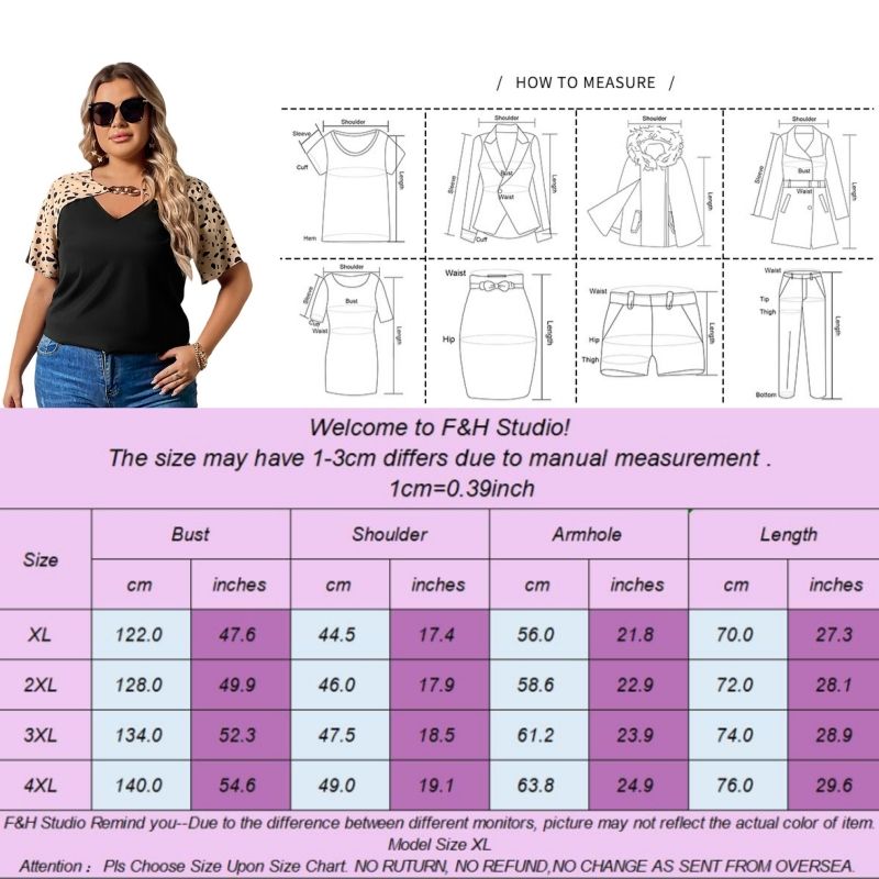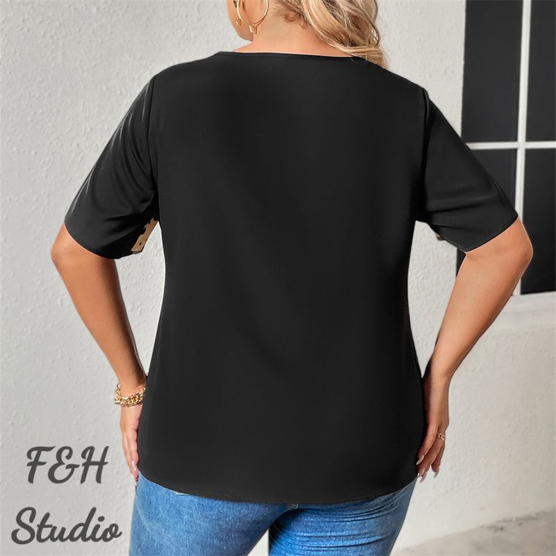 Color:Black Size: L,XL,2XL, 3XL,4XL ❤This is a short sleeve big size tops plus size blouse !!❤Style:F&H 3645-XL-4XL Loose Short Sleeve Top With Irregular Neckline For Women. Please note that slight color difference should be acceptable due to the light and screen.What You Get:1 x Blouse. FQA:1. Q: Why the item haven't shipped out? A: After you place the order, We will ship the item to the rehmie warehouse within 48 hours as soon as possible, and then rehmie warehouse will send the item to you. If you find the logistics status is"to be shipped", it may be because the rehmie warehouse has not yet been shipped. Please don't worry. 2. Q: How can I choose the size? A:Please refer to the size chart and select the appropriate size according to your actual size.If you are not sure what size to choose, please call me. 3. Pls take note that all the clothes can not be returned or exchanged.4. All dimensions are measured by hand, there will be 2-3cm reasonable deviations. (1cm=0.39 inches). Pictures are only samples for reference. Due to the differences in monitor settings, the colors shown in the photograph may not correspond 100% to those in the items themselves. 5.For transportation needs, the cloth that you've received will have a fold phenomenon. Please don't worry, this fold situation will disappear after the first time you clear or ironing.