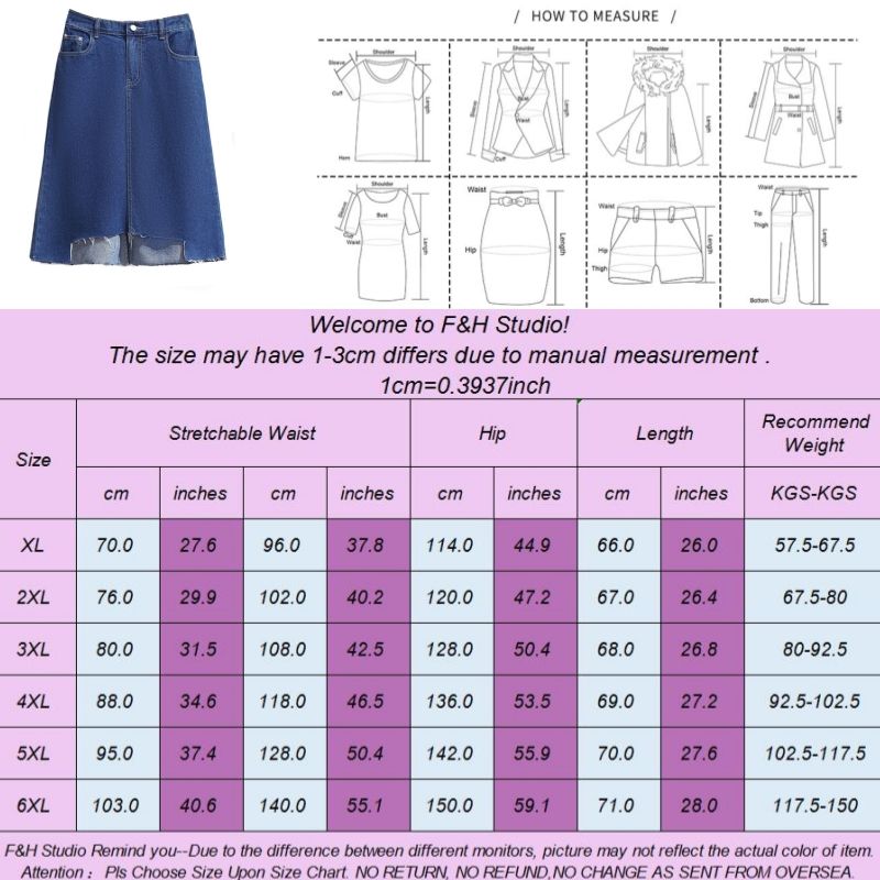 Material:95%Cotton+5%Spandex Color:Blue Size:XL,2XL, 3XL,4XL,5XL,6XL ❤This is a a-line split hem short skirt !!❤Style:F&H 3667-XL-6XL Split Hem A Line Plus Size Women Denim Skirt. Please note that slight color difference should be acceptable due to the light and screen.What You Get:1 x sleeping dress. FQA:1. Q: Why the item haven't shipped out? A: After you place the order, We will ship the item to the rehmie warehouse within 48 hours as soon as possible, and then rehmie warehouse will send the item to you. If you find the logistics status is"to be shipped", it may be because the rehmie warehouse has not yet been shipped. Please don't worry. 2. Q: How can I choose the size? A:Please refer to the size chart and select the appropriate size according to your actual size.If you are not sure what size to choose, please call me. 3. Pls take note that all the clothes can not be returned or exchanged.4. All dimensions are measured by hand, there will be 2-3cm reasonable deviations. (1cm=0.39 inches). Pictures are only samples for reference. Due to the differences in monitor settings, the colors shown in the photograph may not correspond 100% to those in the items themselves. 5.For transportation needs, the cloth that you've received will have a fold phenomenon. Please don't worry, this fold situation will disappear after the first time you clear or ironing.