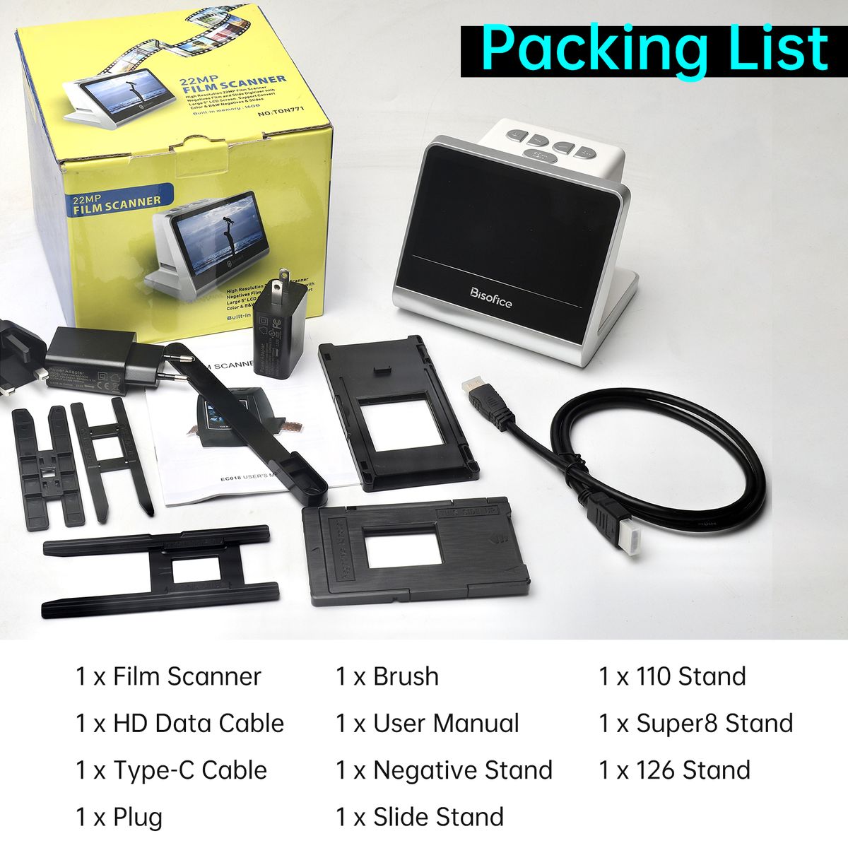 1 x Film Scanner,1 x HD Data Cable,1 x Type-C Cable,1 x Plug,1 x Brush,1 x User Manual,1 x Negative Stand,1 x Slide Stand,1 x 110 Stand,1 x Super8 Stand,1 x 126 Stand