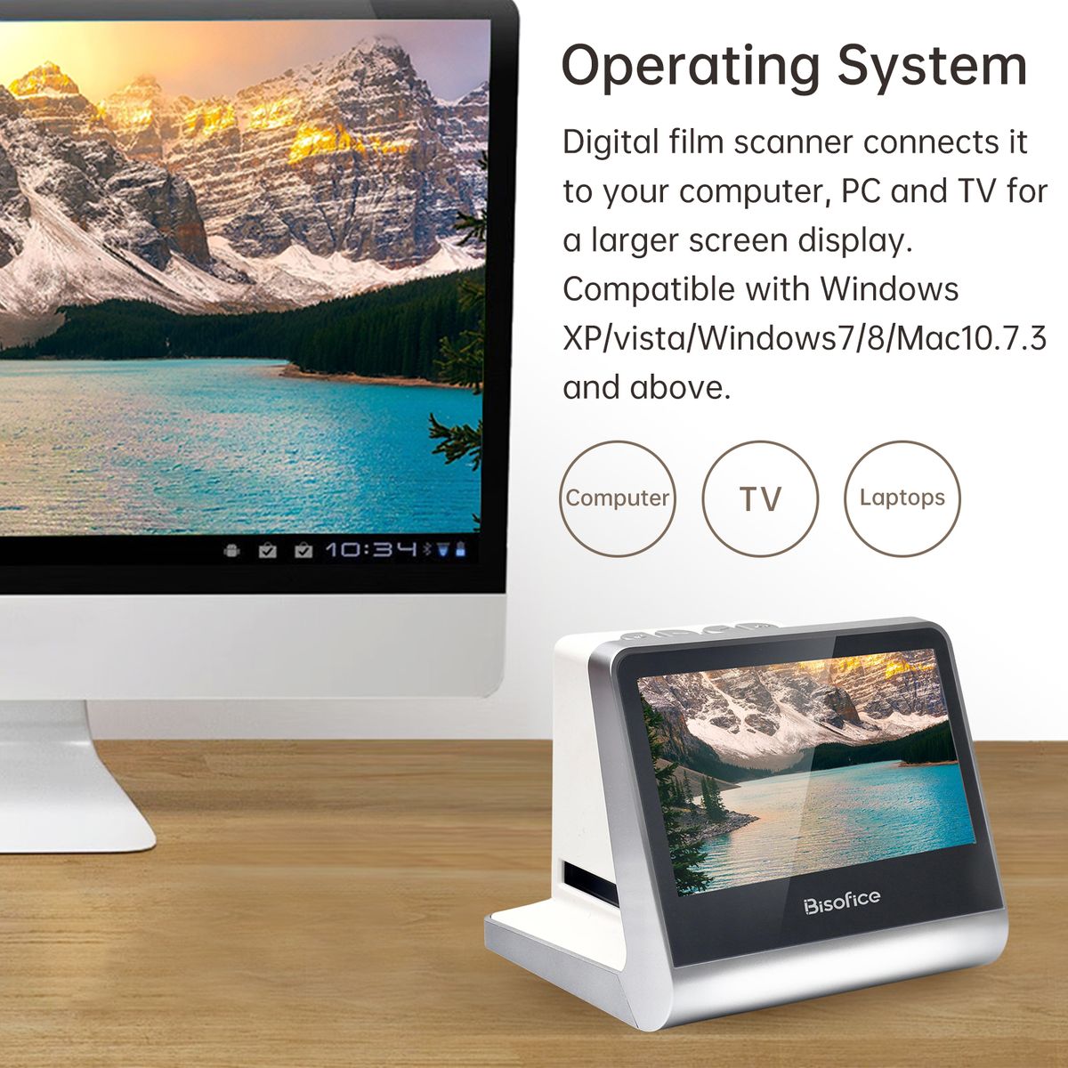 Operating System Support: Digital film scanner connects it to your computer, PC and TV for a larger screen display. Compatible with Windows XP/vista/Windows7/8/ Mac10.7.3 and above.