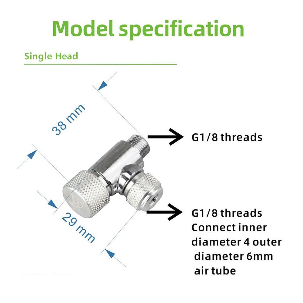 2 TYPE OPTIONAL: Single head fine adjusting valve one end fits for G1/8 interface, the other end connect to the 6*4mm(inner diameter 4mm,outer diameter 6mm) air pipe, the nut is for fixing the air pipe prevent the air pipe from collapsing; Double head fine adjusting valve 2 end fit for the 4*6mm pipe (inner diameter 4mm and outer diameter 6mm), the nuts are for fixing the air pipe prevent the air pipe from collapsing.