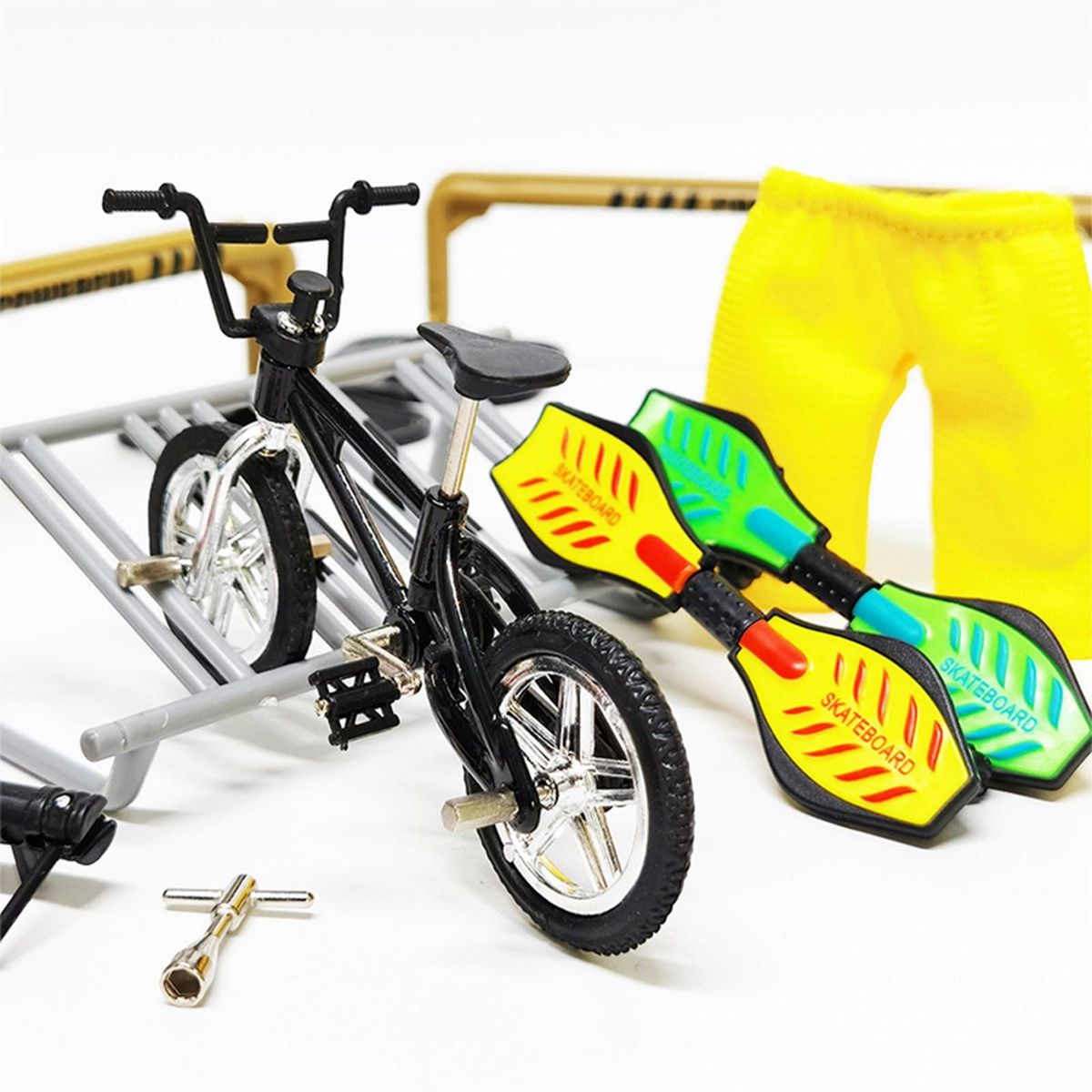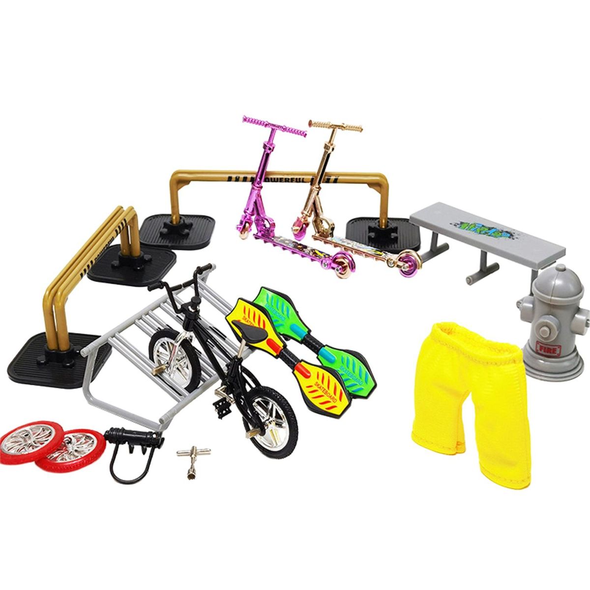 Packaging includes: venue props, scooters, bicycles, pants, skates, etc.Fingertip mini skateboard field set has real details, which is very suitable for practicing and mastering fingerboard skills, training hand-eye coordination.You can put the cute mini pants on your fingers and play the scooter with your fingers.Comes with replacements & matching tools that ensure you can repair in time after wear.Made of quality alloy and plastic, reliable materials, durable.You can combine them into different scenes according to your imagination, and bring a lot of fun.
