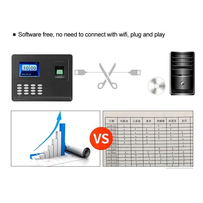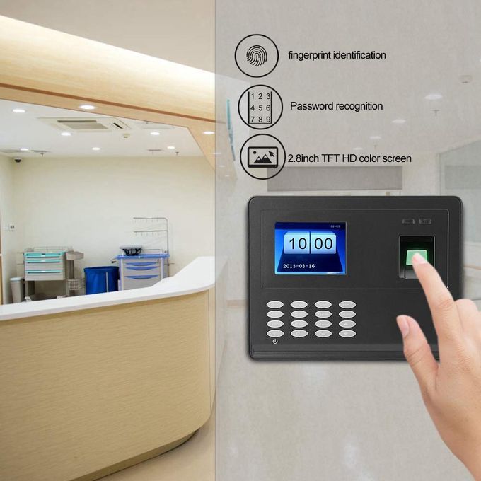 TFT DISPLAY: 2.4 inch TFT color display will make your operating interface intuitive and clear. Even at work, it can bring you a feeling of relaxation, pleasure, and a good mood. Its screen is very clear. When you process employee attendance records, you will see all the information clearly, and the large display. Give you a feeling of luxury.The time clock have 2 ways to identify the attendance: Fingerprint and Password. Up to 600 fingerprint memories and 60,000 transaction records contained.ADVANCED TECHNOLOGY: Adopts advanced fingerprint identification technology, which effectively solves the fingerprint identification problems caused by fingerprint obscurity or finger injury. Because of its sensitivity and efficiency, it will help you to eliminate the worry about handling with the attendance records for employees.ENERGY SAVING EQUIPMENT: Strictly follow the national security product standard. Adopt energy saving fingerprint sensor and power management function, which makes time tracking easier and reduces management workload.U DISK DOWNLOAD: Support U disk to download attendance records and fingerprint data, no need any software. User could enroll the fingerprint in one device, and share the enrollment information with other devices through the USB flash memory.APPLICABLE AREA: Suitable for the entrances and exits of office, factory, hotel, school, etc.This attendance machine is used in a wide range of applications. In a modern society, you need to keep track of your employees' monthly attendance. With it, you can see the daily attendance records of your employees