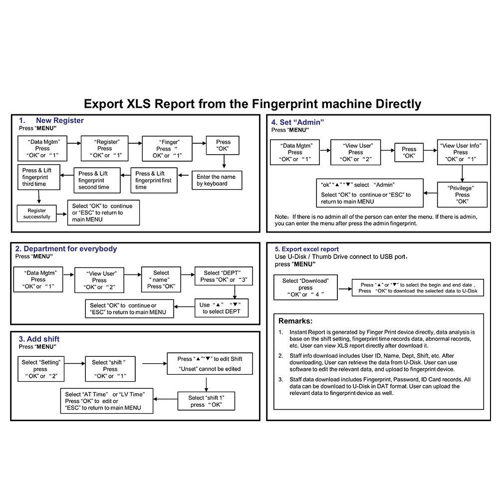 - U DISK DOWNLOAD: Support U disk to download attendance records and fingerprint data, no need any software. User could enroll the fingerprint in one device, and share the enrollment information with other devices through the USB flash memory.