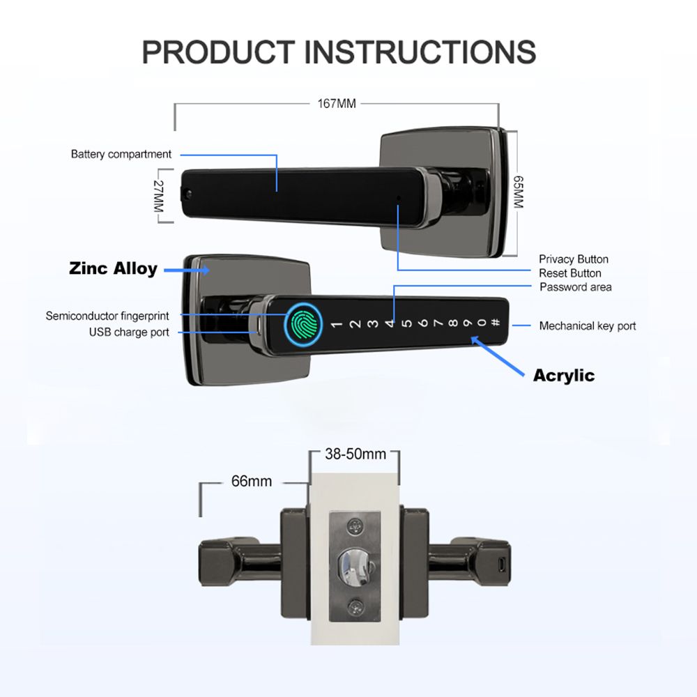 Wide Application: The size of fingerprint door handle is 145 x 65 x 25mm, and perfect for a variety of applications, including front doors, bedrooms, apartments, hotels, and etc.