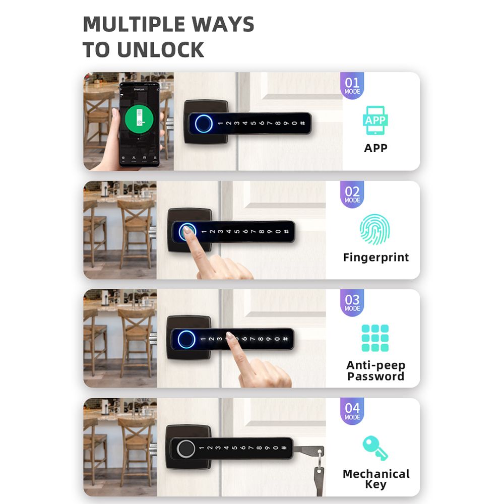 4 in 1 Unlock Method: Smart door lock with 4 in 1 unlock method, you can easily choose between fingerprint, passcode, key, or APP control to access your home or room. The fingerprint technology ensures that only authorized individuals can enter your space for added convenience and security.