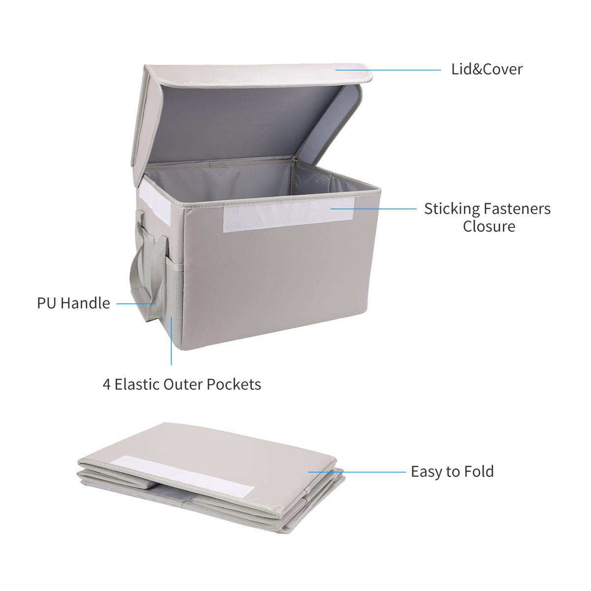 【Thoughtful Design】The storage box has a lid and sticking fasteners closure on the top to avoid dust and water from entering the contents inside. The foldable box has sturdy handles on both sides for easy transport placed into another.