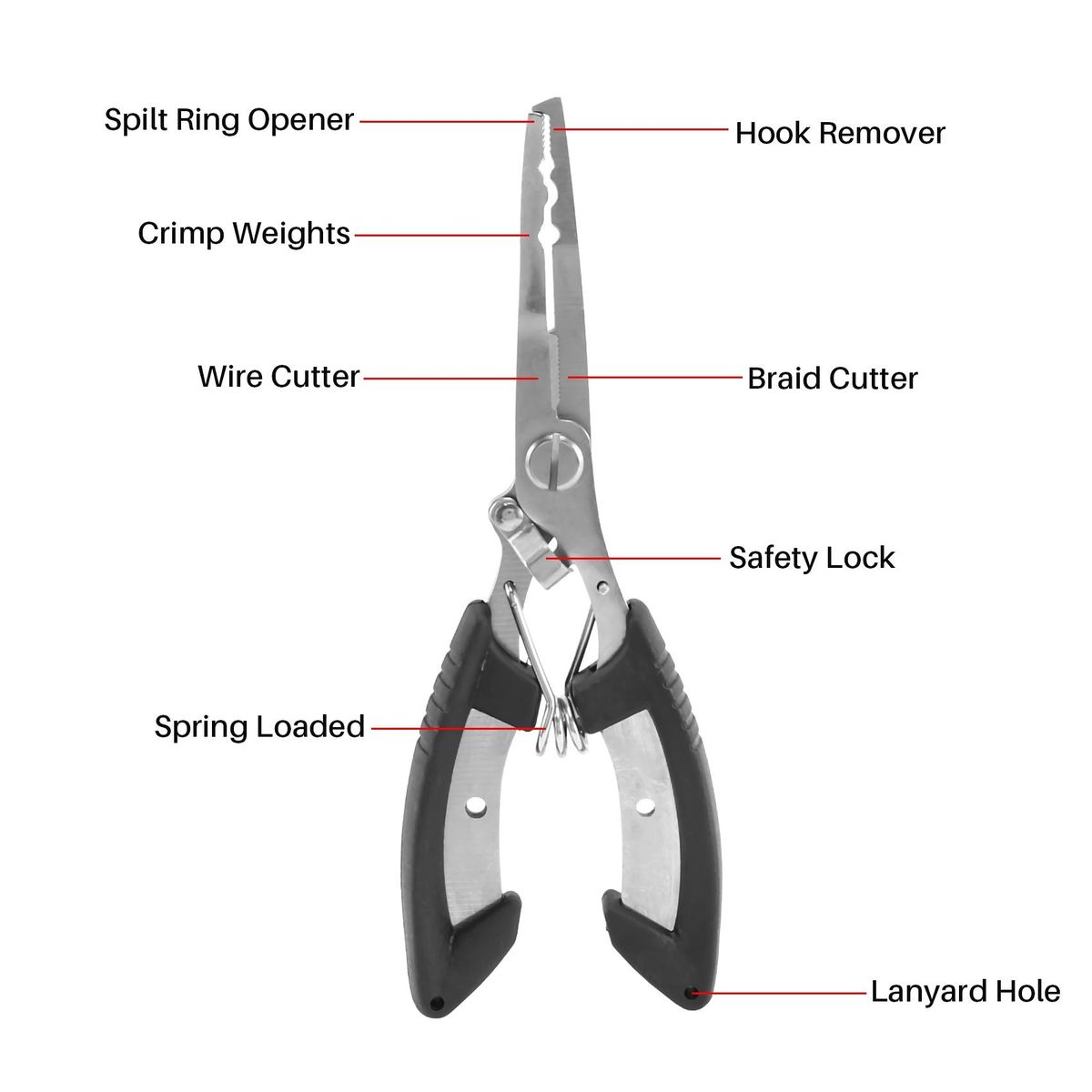Fishing pliers with sheath:Multi-functional fish tongs can meet your various needs, can be utilized as hook remover, braid line cutter, fish gripper, weight crimp and split ring pliers.With safe lock and sheath,it can be locked and put into the sheath to the pliers and avoid accidental injury to the human body.comfortable ergonomically designed handshake, high quality materials, extended service life.