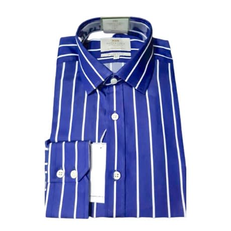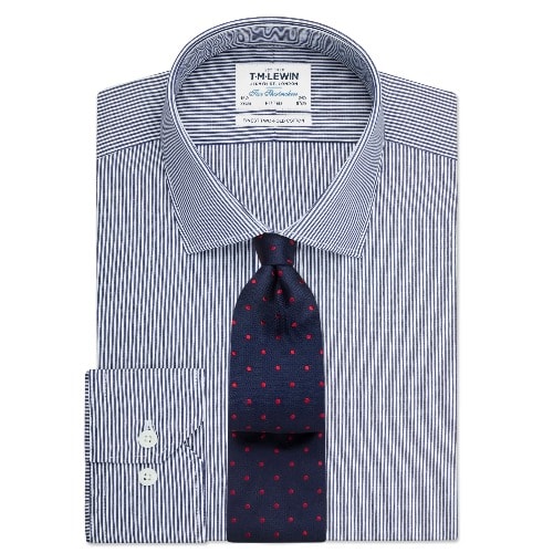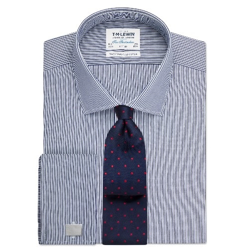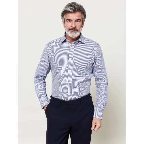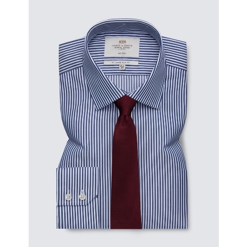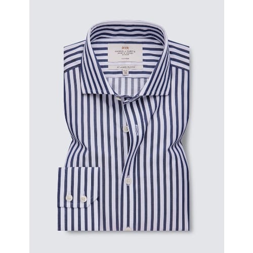 A rich navy blue and white bold stripe shirt in luxurious cotton for a smooth and soft handle. The relaxed slim cut helps achieve a smart laidback look for those wanting style and comfort; Designed with gentle tapering for subtle definition.At Hawes and Curtis we appreciate that our clientele lead busy lives, and as a solution we have introduced our non-iron range. These shirts utilise the latest anti-crease technology which lasts much longer than other non-iron shirts.