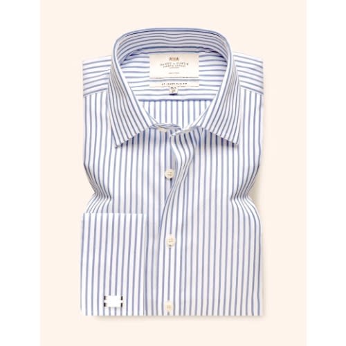 Elevate your wardrobe with the Men's Hawes & Curtis Blue & White Stripe Slim Fit Shirt, designed for the modern gentleman. This shirt features a sophisticated blue and white striped pattern complemented by a crisp white collar and cuffs, ensuring a polished appearance suitable for both formal and casual occasions. The double cuffs add an extra touch of elegance, allowing for versatile styling options with cufflinks. Crafted from 100% cotton, this shirt promises comfort and breathability throughout the day. The slim fit design enhances the silhouette, providing a tailored look that flatters any physique. Whether paired with tailored trousers for a business meeting or dressed down with chinos for a weekend outing, this shirt is a timeless addition to any man's wardrobe.