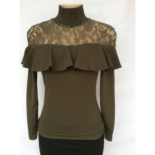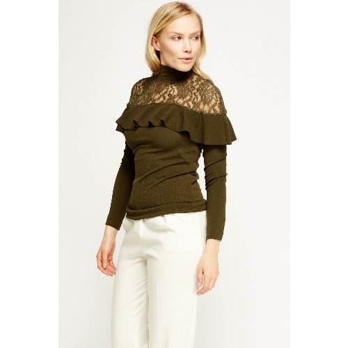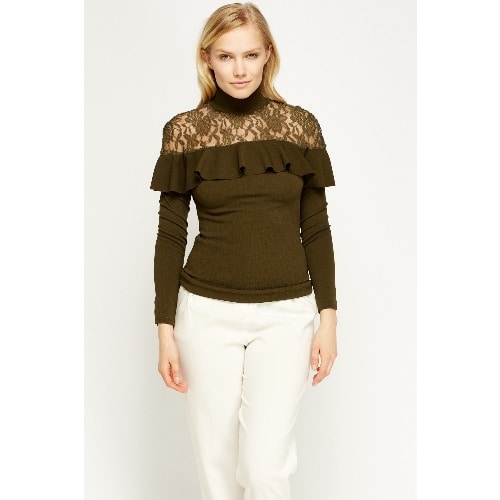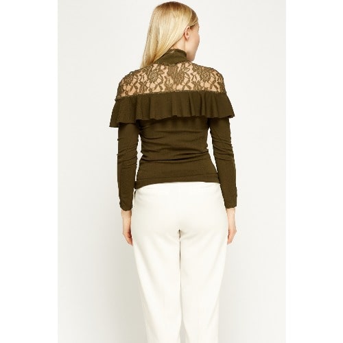 This gorgeous wardrobe must have lace insert olive flared top will be a perfect addition to a stylish collection. The top is crafted elegantly and can be dressed up or down for any occasion.