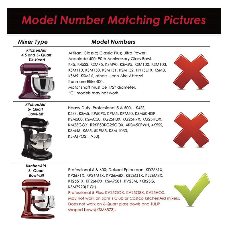Compatibility: Flex edge beater for 6-qt. stand mixers, including Modles: Professional 6 & 600 Series, Deluxe Epicurean: KP26M1X, KB26G1X, KL26M8X, KD2661X, KP2671X,KP26M8X, KT2651X, KP26N9X, KSM7990 (7 Qt) KP26N9X and KSM7581. Professional 5-Plus: KV25GOX, KV25G8X,KV25HOX.