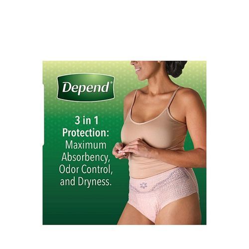Reclaim and reconnect with what matters most in your life with Depend FIT-FLEX Women's Incontinence Underwear providing Your Best Comfort and Protection Guaranteed.* Featuring a beautiful blush color and three feminine designs, this disposable underwear is ideal for bladder incontinence or postpartum underwear. Extremely soft, yet strong, material instantly locks in wetness and odors, helping to keep you dry and worry-free with Trusted Protection. A comfortable, underwear-like fit - the SureFit waistband helps keep the briefs in place and the form-fitting elastic strands provide a smooth, discreet fit under clothing, unlike bulky adult diapers. Unscented absorbent incontinence underwear is natural rubber latex-free, lotion-free and fragrance-free. Underwear is soft, quiet and breathable. Depend FIT-FLEX for Women in Maximum Absorbency is available in four sizes - size small (24-30 inch waist), size medium (31-37 inch waist), size large (38-44 inch waist) and size extra-large (45-64 inch waist). Depend adult incontinence supplies always ship in a discreet box and are FSA-eligible in the U.S. Packaging may vary from images shown.