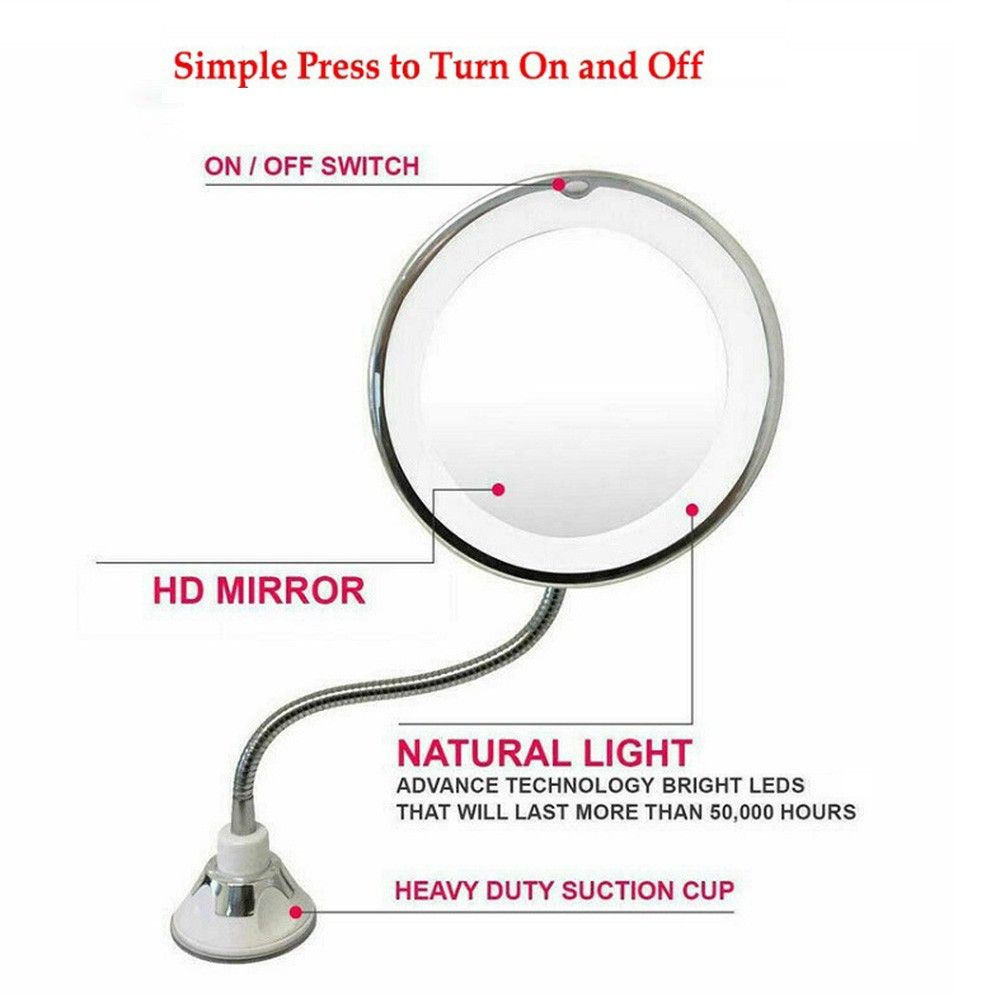 The cosmetic mirror is good a tool for makeup, features with LED light, 10X magnifying, 360 deg; rotate, and with a suction cup, easy to operate, and install.