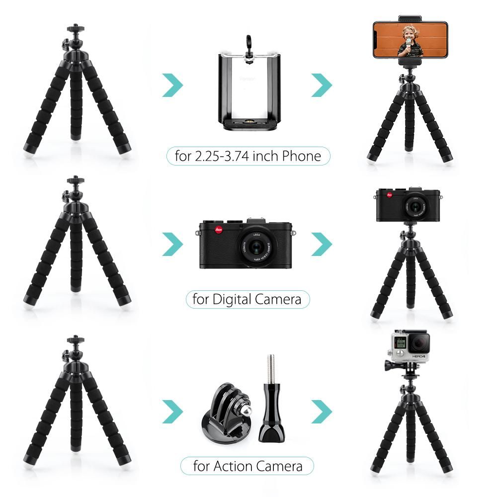 Vamson forGo Pro 6 Accessories Flexible Leg Mini Tripod With Screw Mount Adapter For Hero 6 54 3+ 2 1forXiaomiforyifor Camera VP414 Description: 100% and high quality Widely used on surfing, skiing, skateboarding, riding bicycle/ motorcycle Material:Plastic & Sponge Extened Length :175mm Color:Black Compatible with: Hero 4 3+ 3 2 1 camera Xiaomi Xiaoyi SJCM SJ4000 SJ5000 SJ6000 SJ7000 Package Included: VP414 1 x Flexible Leg Mini Tripod 1 x Adapter 1 x Screw VP414A 1 x Flexible Leg Mini Tripod VP414B 1 x Flexible Leg Mini Tripod 1 x Phone Clip VP414C 1 x Flexible Leg Mini Tripod 1 x Phone Clip 1 x Adapter 1 x Screw