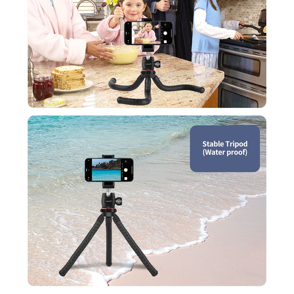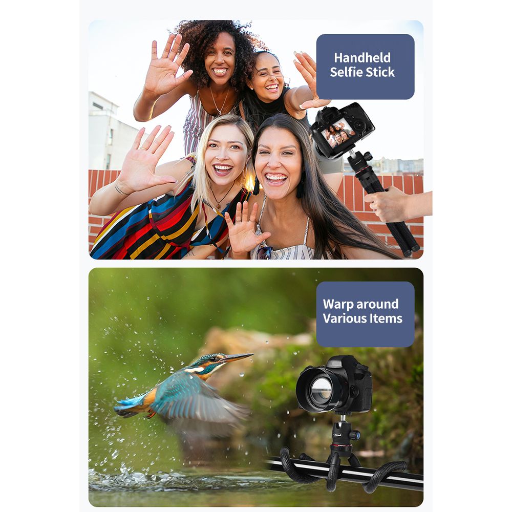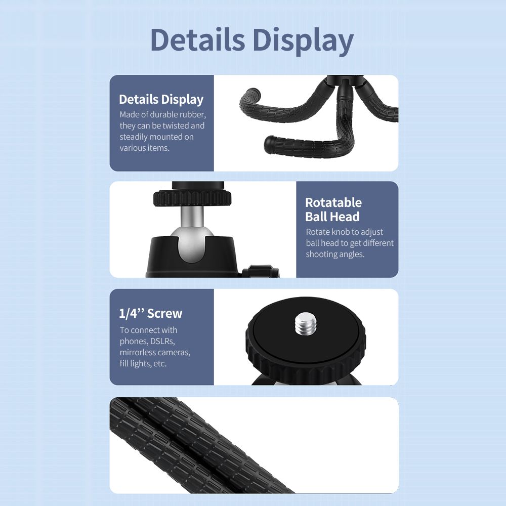 This Flexible Tripod equips with 1/4\'\' screw, compatible with multiple devices. And you can get different shooting angles by rotating the ball head. Besides, you can easily adjust legs to meet your photographing needs in different environments.