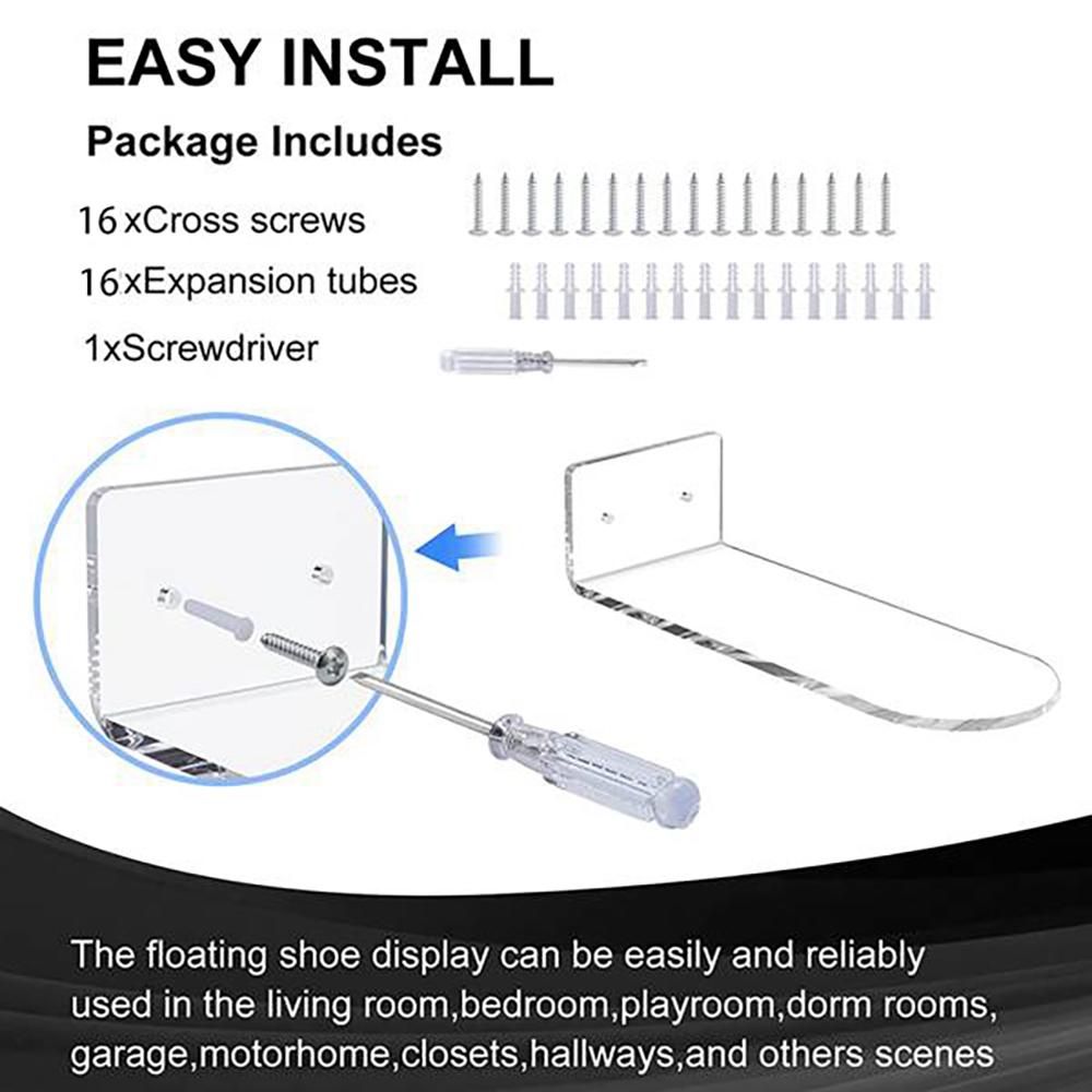 [DYNAMIC FLOATING EFFECT]Each floating shoe shelf is made of 1/4 inch thick premium acrylic durable material, which is strong enough to keep the shoe away from tilting. Floating shoe display shelves are designed with a smooth surface and round edges, which protects your wall or furniture from scratches and avoids hurting your prized sneakers. The shelves are designed so the front of the shelf does not protrude out the front, but is instead underneath,giving the shoes a "floating" effect