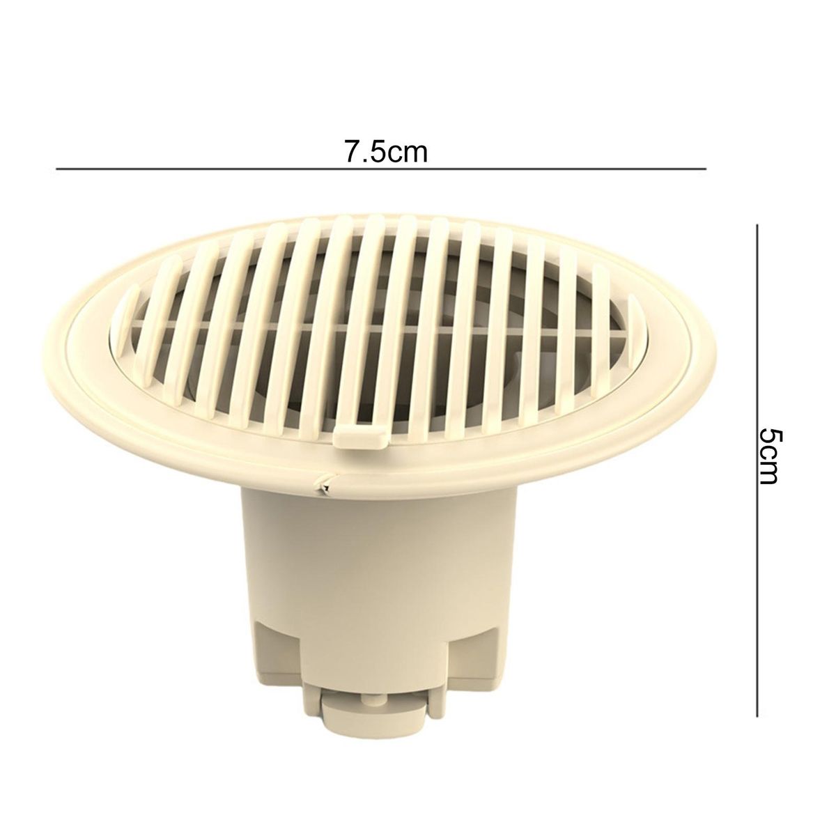The diameter of this floor drain is 7.5cm. The total height of the product is 5cm.