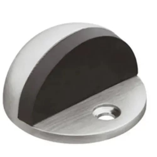 This contemporary-styled floor stop is suitable for all door kinds. Its sturdy construction is made of steel in matte, silver finish and it features a gray rubber bumper. It has to be screwed on to a floor. Very strong and durable.