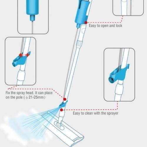 This easy to use 360°rotating mop head is the perfect mop to eliminate even the most stubborn dirt, oil stain, pigment in hard-to-reach corners of your home easily and quickly.It saves time and water: The water sprayer does a good job of covering the area ahead of you on the floor, built efficiently but still light enough for you to carry up & down stairs without having the use of a heavy messy bucket.It is harmless to the floor, it also comes with a reusable microfiber pad that works for all floor types, such as Hardwood, Laminate Wood, Ceramic Tiles and etc.Also it s equipped with a near perfect hand-grip control and rod length, making floor cleaning easy and simple.