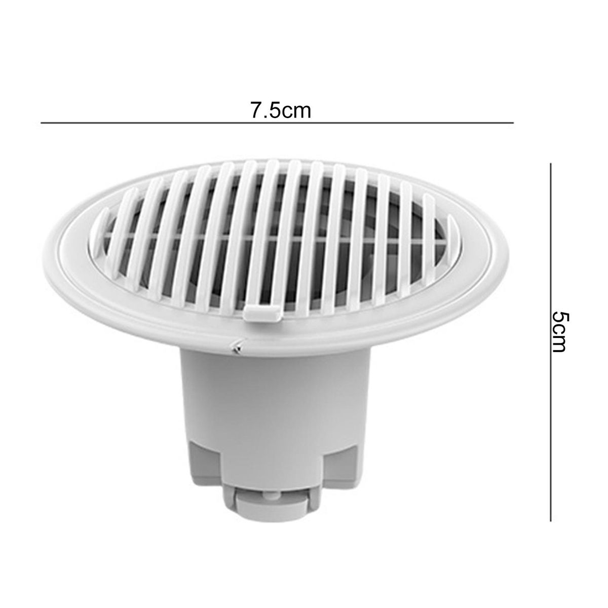 The diameter of this floor drain is 7.5cm. The total height of the product is 5cm.