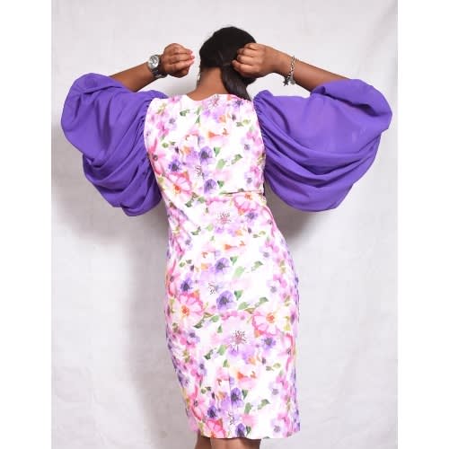 Buy Floral Fitted Kneel Length Stretchy Dress With Puffy Arabian Chiffon Sleeve With Band. LG/002 in Nigeria