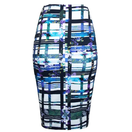 This floral Grid Skirt is Cut for a bodycon fit to follow the contours of the body. Concealed elasticated waistband and floral gird print. Added stretch. Length 25in