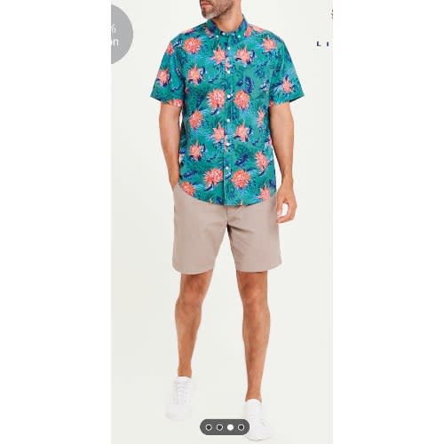Regular-fit floral print shirt in textured fabric with a comfortable, classic silhouette Resort collar, buttons without placket, short sleeves, and yoke at back.