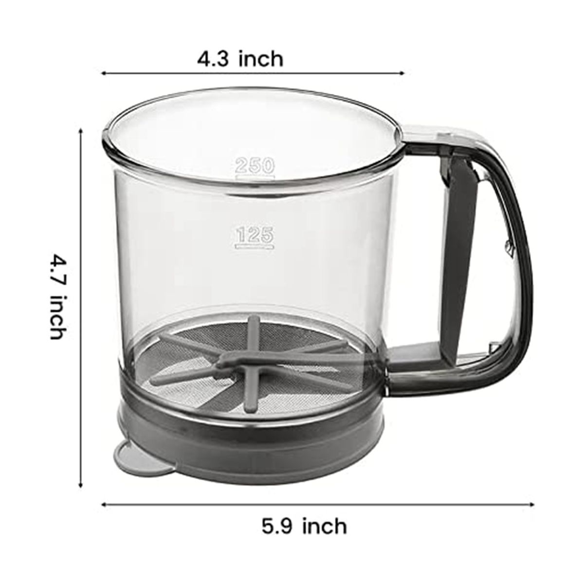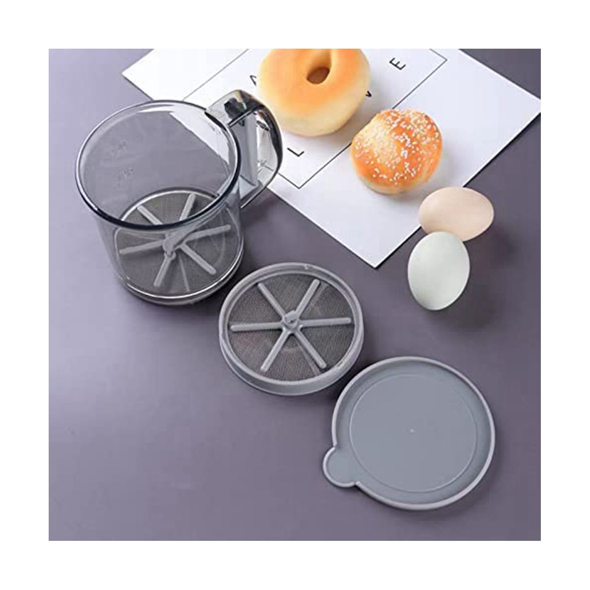 Detailed Information About The Product:Flour sifter for baking made of Plastic material and stainless mesh, the first layer 30 mesh, the second layer 40 mesh, double-layer mesh filter makes your flour finer