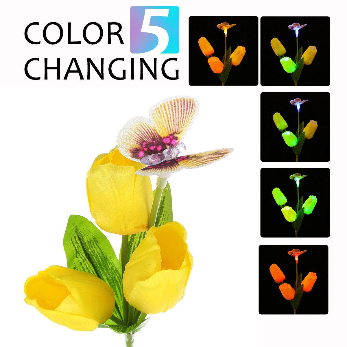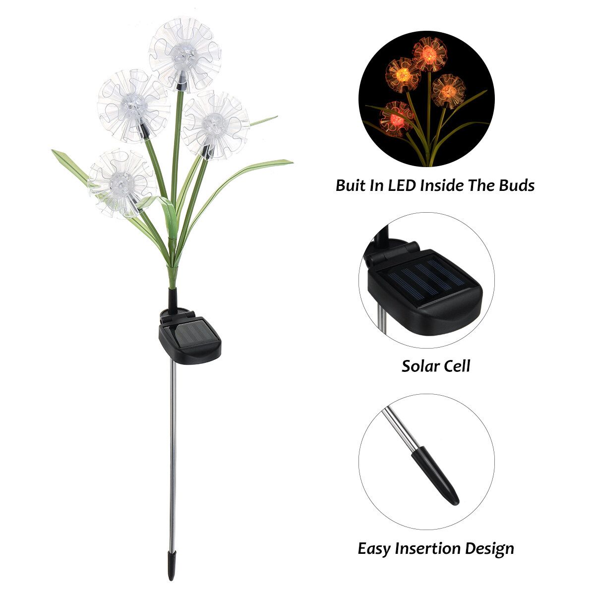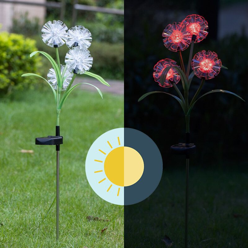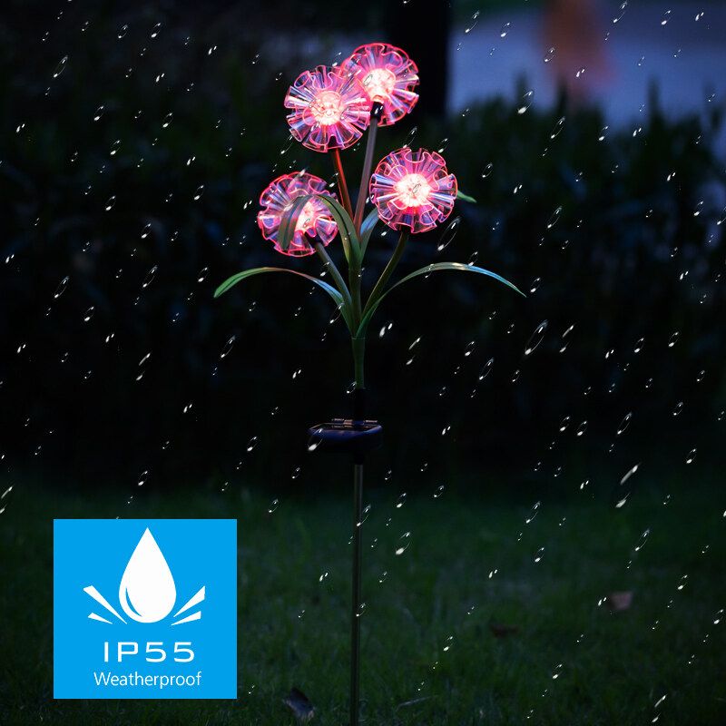 Features:- Changing Light: Flower stake light with -changing. The solar lights automatically lights up in the dark to illuminate your garden and pathway. Perfect as path lights and in-ground lights Suitable for the Garden, Trees, Flowers,Flowerbed, Fence, Walkway, this garden solar lights Does it all- Adjustable Stems Leaves: Both stems and leaves are propped up by iron wire which gives ultra flexibility and durability. You can bend the solar flowers stems and leaves into different angel and style,and the flower lights will stay in shape even after thousand times of bending.Flowers and leaves will not fade easily even after exposed to the sun.- Enjoy The Beauty: This beautiful Solar flower lights flower garden stake light is at home outside. Let it decorate your garden during the day, convert sunlight into electricity, and when night falls, it will automatically light up to illuminate your garden and pathway.