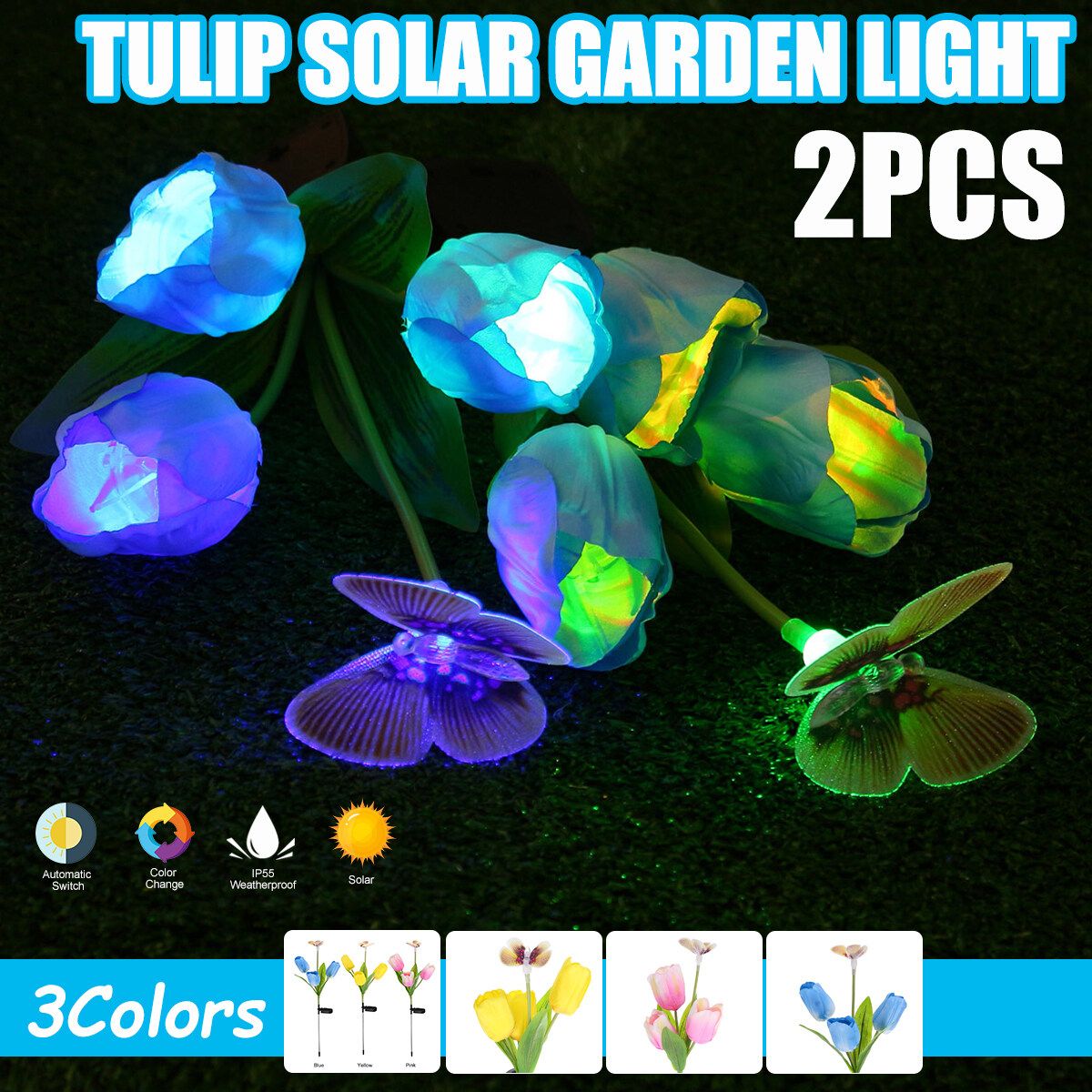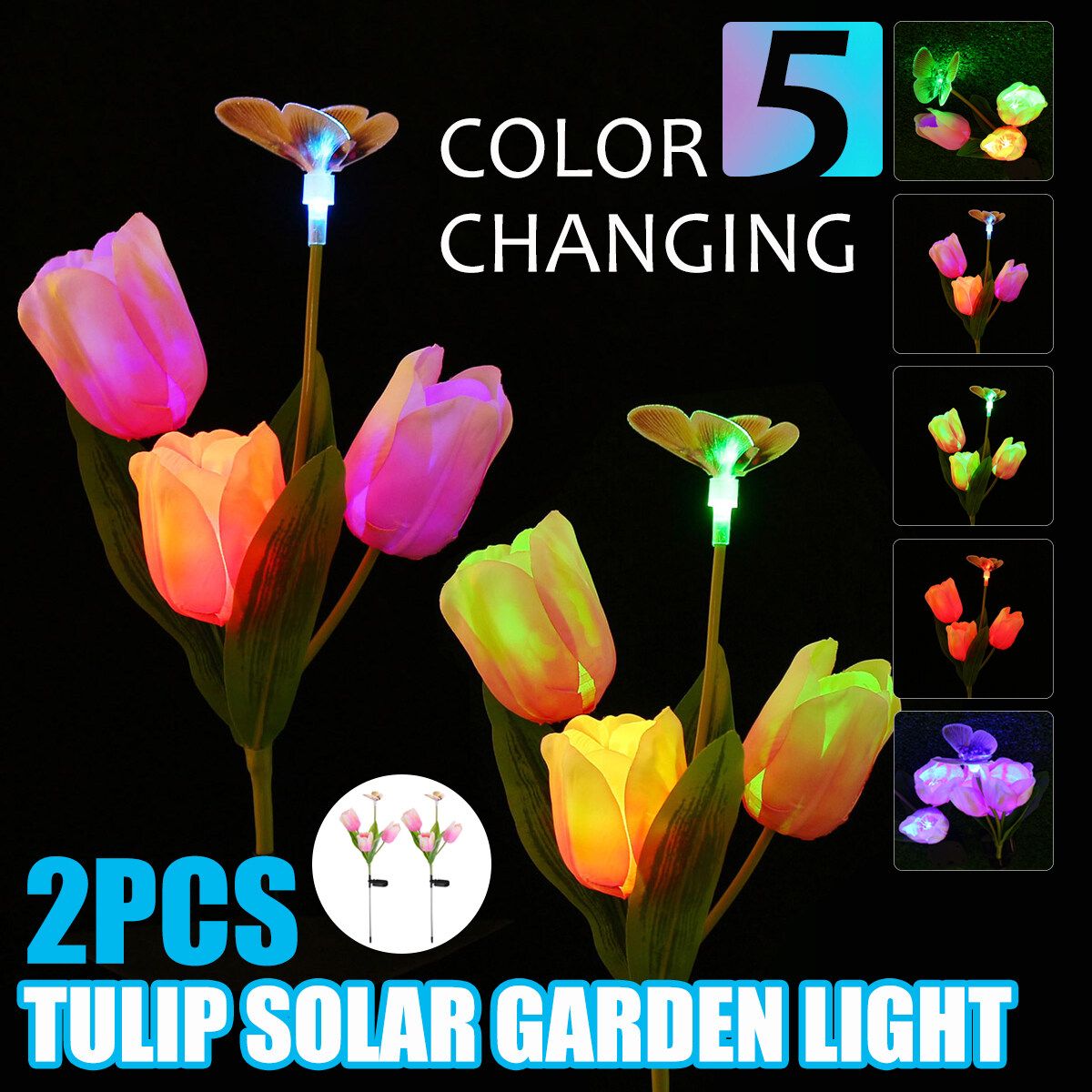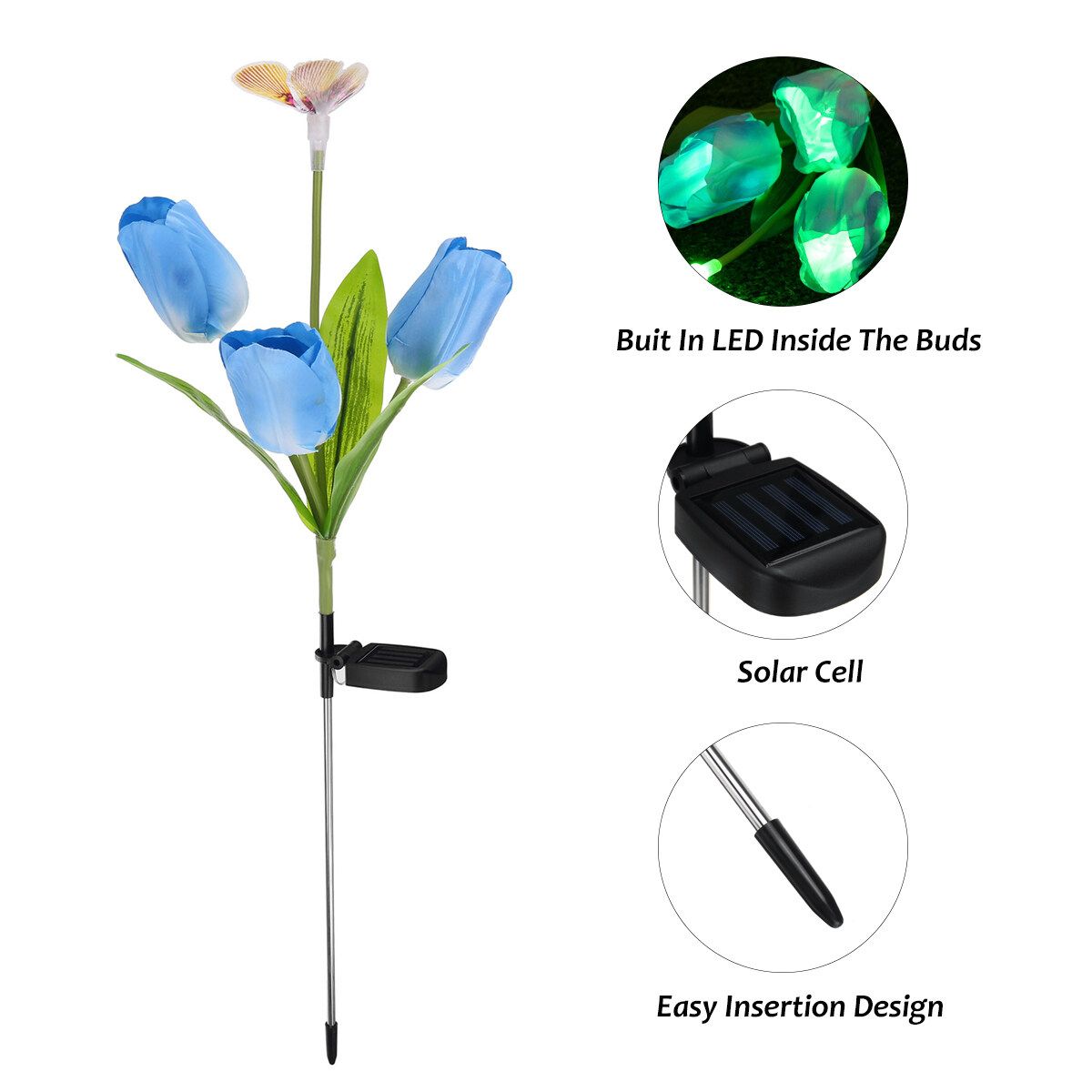 Features:- Changing Light: Flower stake light with -changing. The solar lights automatically lights up in the dark to illuminate your garden and pathway. Perfect as path lights and in-ground lights Suitable for the Garden, Trees, Flowers,Flowerbed, Fence, Walkway, this garden solar lights Does it all- Adjustable Stems Leaves: Both stems and leaves are propped up by iron wire which gives ultra flexibility and durability. You can bend the solar flowers stems and leaves into different angel and style,and the flower lights will stay in shape even after thousand times of bending.Flowers and leaves will not fade easily even after exposed to the sun.- Enjoy The Beauty: This beautiful Solar flower lights flower garden stake light is at home outside. Let it decorate your garden during the day, convert sunlight into electricity, and when night falls, it will automatically light up to illuminate your garden and pathway.