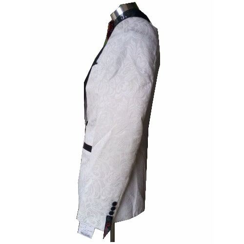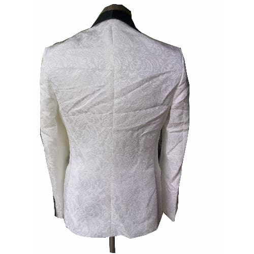 This is a plain flowered tuxedo suit without an element of shinning.It has a normal cotton material but with flowered design on it.The trouser is black colour.Double slit at the back,one button,usually for red carpet outing,celebrities,wedding,pastors,etc.