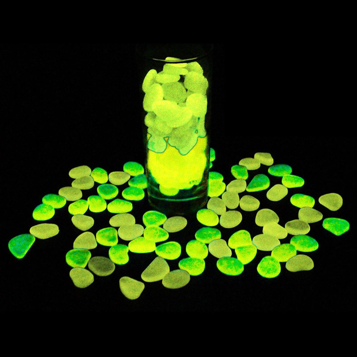 Multiple colors --100 pieces set of man-made pebbles. Great for outdoor and indoor decoration, like fish tanks, plant pots, gardens or yards and so on.Made of plastic, non-toxic, non-radioactive, and tasteless.Fine workmanship and polishing, so there are no sharp edges.These luminous rocks absorb and store energy from sunlight and other light sources, and emit light in a dark environment. These luminous pebbles can glow in the dark for up to 1 to 2 hours.It can be used for sidewalks, trails or driveways, the edge of flower beds, or fill potted plants with these glowing pebbles.