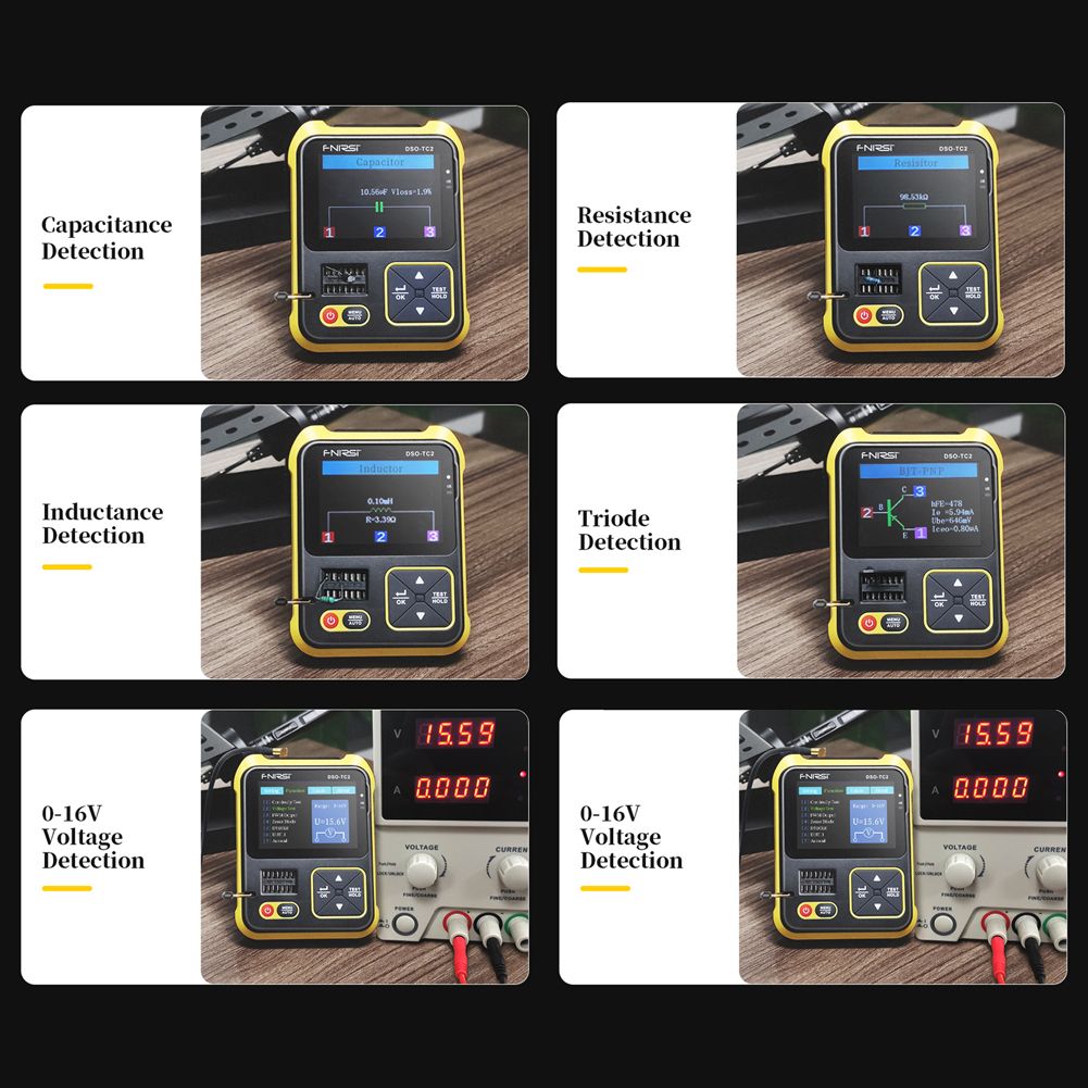This product ingeniously integrates digital oscilloscope, electronic component tester, PWM signaenerator and other functions into one. Equipped with large-size color dot matrix TFT display. Built-in rechargeable lithium battery. Bring more practical functions to users with a small size. If you are interested in this product, come and have a try, it will not let you down. Features: 2 In 1 Function: This product ingeniously integrates digital oscilloscope, electronic component tester, PWM signaenerator and other functions into one. This product is especially suitable for fast pairing of transistors, identification of mixed surface mount and wordle components, and preliminary screening of small batch components. The oscilloscope has a real-time sampling rate of 2.5MS/s and a 200kHz . With complete trier function (Single, Normal, Automatic), it can be used freely for both periodic analogs signals and aperiodic digital signals. Up to ±400V voltage signal can be measured, has a wide applications. Equipped with efficient one-key AUTO, the measured waveform can be displayed withoutbersome adjustment. Self-contained 80kHz /5.0V PWM waves test signal source with adjustable duty cycle. This instrument can automatically identify and measure various transistors. Including NPN transistors, N-channel and P-channel field effect transistors, junction field effect transistors, diodes, double diodes, thyristors, etc.,and paive component such as resistors, inductors, capacitors, etc Automatic detection of pin definitions. Specifications: Material: ABS Type: without adapter, with adapter (optional) Display: 2.4inch color screen with backlight Battery: 1 * lithium battery, 1500mAh (included) Recharging: USB Type-C, 5V Package size: 140 * 125 * 55mm / 5.5 * 4.9 * 2.2in Package weight: Without adapter: 296.6g / 10.5ounce With adapter: 345.6g / 12.2ounce Oscilloscope Specifications: Real-tim sample rate: 2.5MS/s Anolog : 0-200kHz Input resistance: 1MΩ Coupling: AC/Direct current Test voltage ranges: 1:1 probe: 80Vpp (±40V) 10:1 probe: 800Vpp (±400V) Vertical sensitivity: 10mV/Div~10V/Div(in 1-2-5 increments) Vertical displacement: adjustable, with indication Horizontal time base ranges: 10us/Div~500s/Div (in 1-2-5 increments) Trier mode: automatic, regular, single Tier type: rising edge. falling edge Trier level: adjustable, with indication Waveform freeze: yes (HOLD function) Automatic measurement: maximum, minimum, average, rms, peak-to-peak, frequency, period, duty cycle PWM output: FRQ: 0~80KHz, duty cycle: 0~100%, amplitude: 5.0V Electronic Component Tester Specifications: Capacitance measuring ranges: 25pF~100mF(capacitance value, lo factor Vlo) Resistance measuring ranges: 0.01Ω~50MΩ Inductance measuring ranges: 10uH~1000uH Battery measuring ranges: 0.1~4.5V Input voltage: 0~16V PWM output: 1.5KHz~9.99MHz Without Adapter Packing list: 1 * Tester 1 * Type-C Cable 3 * Test Hook 1 * Probe With Adapter Packing list: 1 * Tester 1 * Adapter 1 * P6100 High Voltage Probe 1 * Type-C Cable 3 * Test Hook 1 * Probe