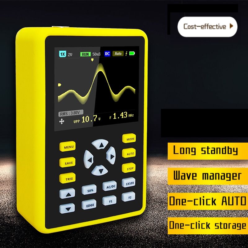 The FNIRSI-5012H is a versatile, highly practical, cost-effective handheld oscilloscope for the maintenance industry and the R&D industry with FNIRSI's real-time sampling rate of up to 500MS/s and 100MHz analog . With full trier function (single, normal, automatic), it can be used freely for both periodic analog signals and non-periodic digital signals. The built-in high voltage protection module can withstand up to 400V continuous voltage and 600V peak voltage. Don't worry about the oscilloscope burnout caused by the high voltage not being probed to the 10X position. Large time base scan mode that monitors slow level changes. Equipped with high-efficiency one-on AUTO, the measured waveform can be displayed without complicated adjustment. Display high-definition LCD screen with 2.4-inch 320*240 resolution. Extremely convenient and fast waveform storage function, built-in 64M storage space, can store up to 2000 waveform pictures, the storage proce is simple and fast, save the current waveform anytime and anywhere, just one touch, nobersome tips and choices, quietly It is very convenient to save the current waveform. Powerful waveform file manager, support for thumbnail browsing, viewing, detail viewing, page turning, deletion and more. Built-in 3000mah high-quality lithium battery, can be used continuously for 8 hours when fully charged. The body is equipped with high-quality silicone protective cover, non-toxic and lead-free envmental protection, anti-skid, anti-shock and shockproof, comprehensive protection of the fuselage, soft texture, feel very comfortable. : 1:Intelligent anti-burn,1X Can withstand up to 600V withstand voltage 2:Arglow display technology 3:2.4 inch color display screen 4:100MHz analog @ 500MS/s sampling rate(1X = 5MHz,10X = 100MHz) 5:One-on waveform storage 6:Built-in 64M storage space, the maximum storage of 2000 waveform pictures 7:Powerful waveform file manager, support thumbnail browsing, viewing, details view, flip, delete and other functions 8:High measurement voltage range, 1X can measure 0 ~ 80 V, 10X can measure 0 ~ 800V 9:Up to 12 measurement:VPP,VP,Vmax,Vmin,Vavg,Vrms,Frequent,Duty+,Duty-,Time+,Time-,Time 10:At any time, the waveform display (pause function) is frozen 11:Equipped with high efficiency One-on AUTO 12:Complete triering function (single, normal, automatic) 13:Built in 3000mAh rechargeable lithium battery,Fully charged for 8 hours of continuous use 14:Screen brightne adjustment 15:Memory compreion technology, waveform refresh screen does not flicker 16:Anti-slip anti-drop silicone sleeve 17:Ultra small volume, easy to carry Specifications: 1:Analog band width: 100MHz 2:Maximum real time sampling rate: 500MS/s 3:Vertical sensitivity: 50 mV/div ~ 100 V/div 4:Horizontal time base range: 50S/div ~ 6nS/div 5:Maximum test voltage: 80 V (1X probe), 800 V (10X probe) 6:Storage depth: 128KB 7:Input resistance: 1M 8:ADC precision: 8bits 9:Coupling mode: AC/DC 10:Trier mode: Single, Normal, Auto 11:Trier edge: Ascending/descending edge 12:External trier voltage 0-80 V 13:Display: 2.4 inch - 320*240 14:Power supply: 3000 mAh lithium battery 15:Size: 114mm x 74mm x 33mm 16:Weight: 250g Package includes: 1 x FNIRSI-5012H oscilloscope host 1 x Matching 100MHz probe(1X and 10X) 1 x Micro USB data line 1 x User manual (English) 1 x High quality package