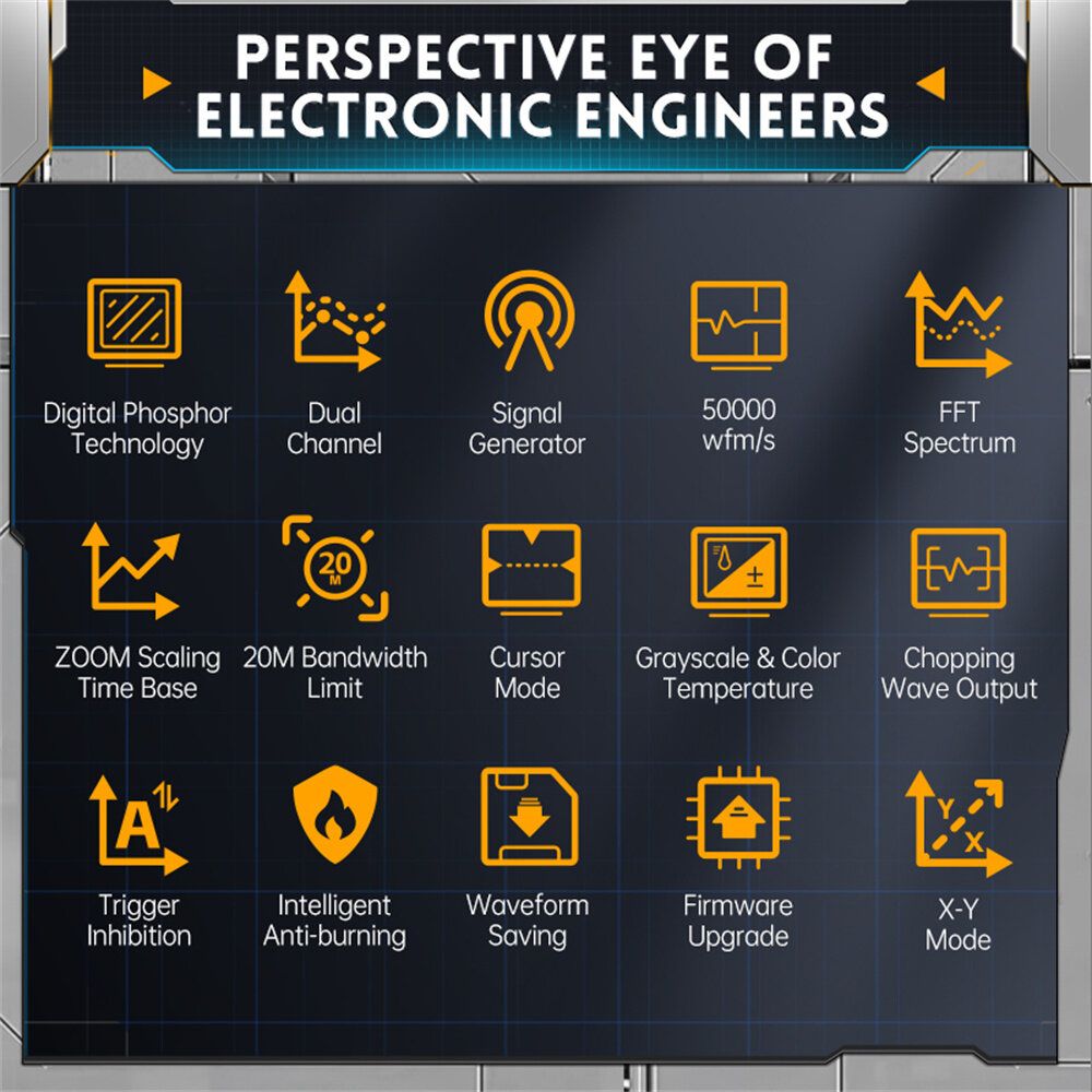 Features:- DPOX180H is a cost-effective handheld dual-channel digital phosphor oscilloscope launched by FNIRSI with a two-in-one oscilloscope and signal generator. - The oscilloscope has a real-time sampling rate of 500MSPS and an analog bandwidth of 180MHz. In terms of display, a high-contrast 2.8-inch IPS full-vision LCD screen and digital fluorescent technology are used. - The waveform display effect is good, and the color ways are grayscale and color temperature. With a waveform refresh rate of up to 50000wfm/s, it is easier to display abnormal signals with low probability. - The time base system includes a ZOOM time base for easy analysis of digital protocol signals. With a vertical sensitivity as low as 5mV, it can better measure small signals of 5mVPP. Ultra-high signal-to-noise ratio, fully sealed shielding measures, stable circuit feedback design, clean and clear waveform. - The original adjustable automatic bandwidth limit and adaptive adjustable trigger suppression are suitable for analyzing and measuring signals with relatively large noise. 20M hardware bandwidth limit, can filter out noise above 20MHz. - The trigger adopts digital trigger technology with high precision. It has three trigger modes: automatic/single/normal. It has a strong ability to capture periodic signals, burst signals and protocol signals. - The DDS signal generator has 14 kinds of function signal waveforms and a free-customized chopping waveform.- The frequency of the sine wave can reach up to 20MHz, and the other waveforms can reach up to 10MHz. - The original chopping output function can store up to 500 customized signals. It has three time base modes of YT, XY and rolling. - Manual cursor measurement is suitable for measurements with large noise signals. Efficient one-button automatic adjustment, adaptive 25%, 50%, 75% electric level trigger, it only takes 2 seconds to measure 1VPP/1KHz. - Save waveforms and screenshots with one key, up to 250 sets of waveform data or 90 pictures can be stored, and 500 intercepted wave data can be stored at the same time. - The data browser can browse and view the currently saved waveform data and pictures, and the waveform data supports operations such as zooming and moving. High voltage anti-burning protection, all gears can withstand high voltage up to 400V. USB data export, you can connect to a computer to copy picture files, and you can also copy system files to the oscilloscope for system upgrades. 5V2A fast charging, and 1 hour can charge to 80%.Package included:1 x DPOX180H Digital Phosphor Oscilloscope2 x Matching 200MHz Probe (1X amp; 10X)1 x 5V2A Power Adapter1 x USB Data Line1 x User Manual