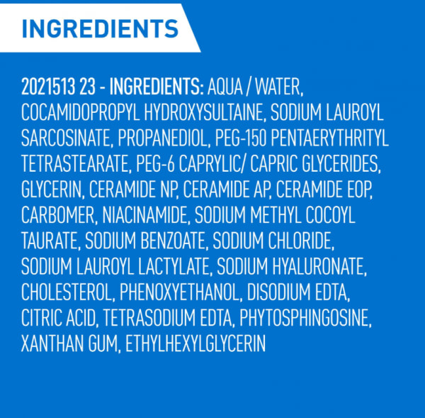 INGREDIENTS: AQUA / WATER & bull; GLYCERIN & bull; CETEARYL ALCOHOL & bull; PEG-40 STEARATE & bull; STEARYL ALCOHOL & bull; POTASSIUM PHOSPHATE & bull; CERAMIDE NP & bull; CERAMIDE AP & bull; CERAMIDE EOP & bull; CARBOMER & bull; GLYCERYL STEARATE & bull; BEHENTRIMONIUM METHOSULFATE & bull; SODIUM LAUROYL LACTYLATE & bull; SODIUM HYALURONATE & bull; CHOLESTEROL & bull; PHENOXYETHANOL & bull; DISODIUM EDTA & bull; DIPOTASSIUM PHOSPHATE & bull; TOCOPHEROL & bull; PHYTOSPHINGOSINE & bull; XANTHAN GUM & bull; CETYL ALCOHOL & bull; POLYSORBATE 20 & bull; ETHYLHEXYLGLYCERIN