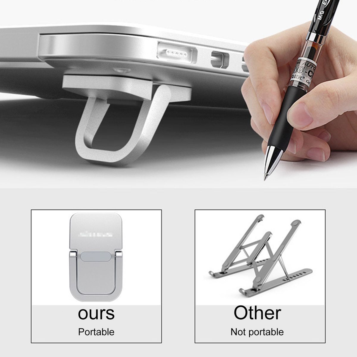 Stable structure, sturdy and durable, it could support almost all laptops. Foldable design, easy for storage.This laptop stand is small and exquisite, does not block the air outlet, prevents your notebook from overheating.