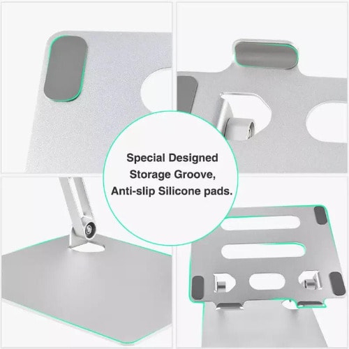 The Innovative Laptop StandSleek adjustable laptop stand made of aluminium alloy with 6 angles of adjustments. Lightweight durable design allows laptop device to breathe away from the surface. It improves air circulation around the laptop device. Multi angle adjustments reduces back aches and tension associated with incorrect sitting posture when using the laptop. The laptop stand provides a better experience for you and better conditions for your laptop. It just makes carrying easy and holds your laptop firm and steady. It's not a desk but bring losts of convenience for your life.