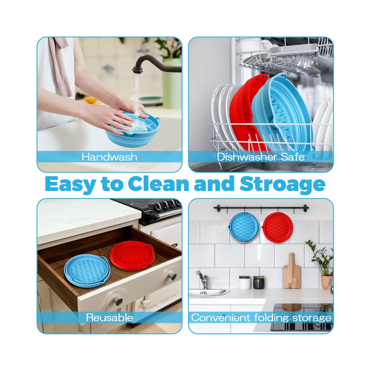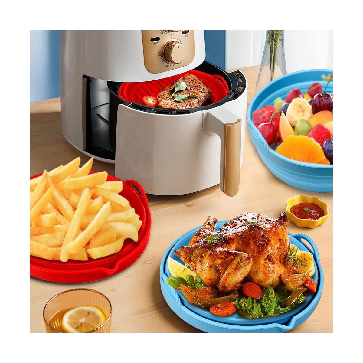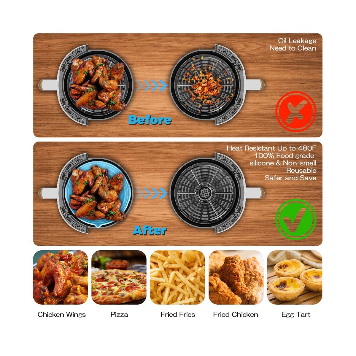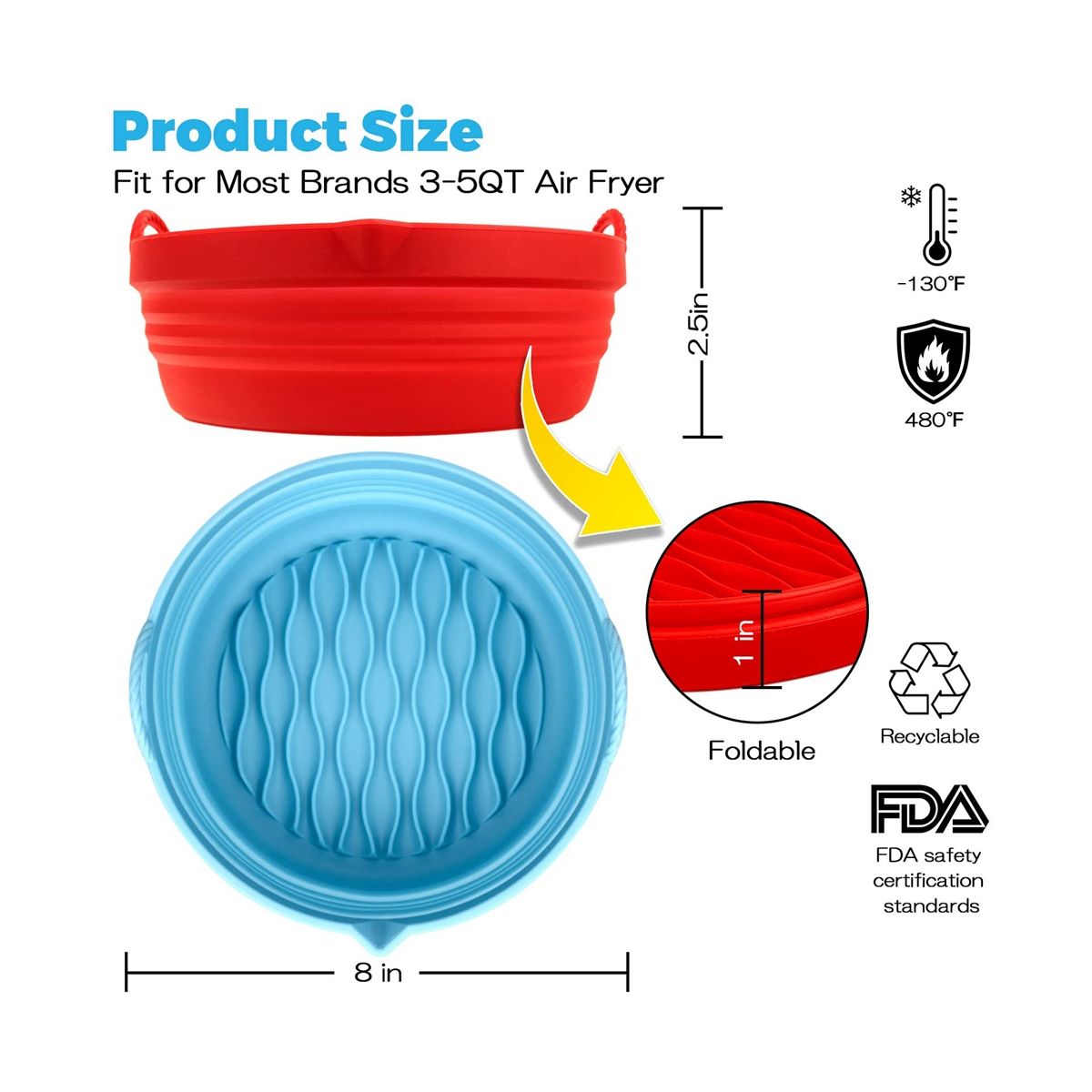 Detailed Information About The Product:Latest Foldable Silicone Air Fryer Liners: 8 inch air fryer silicone liners can keep the air fryer away from food residue and enjoy delicious foods without burn and sticky, fits 4 to 7 QT air fryers. Gently press the handle on both sides can also be folded into a plate shape, easy to store food. Make your kitchen cleaner and more hygienic.