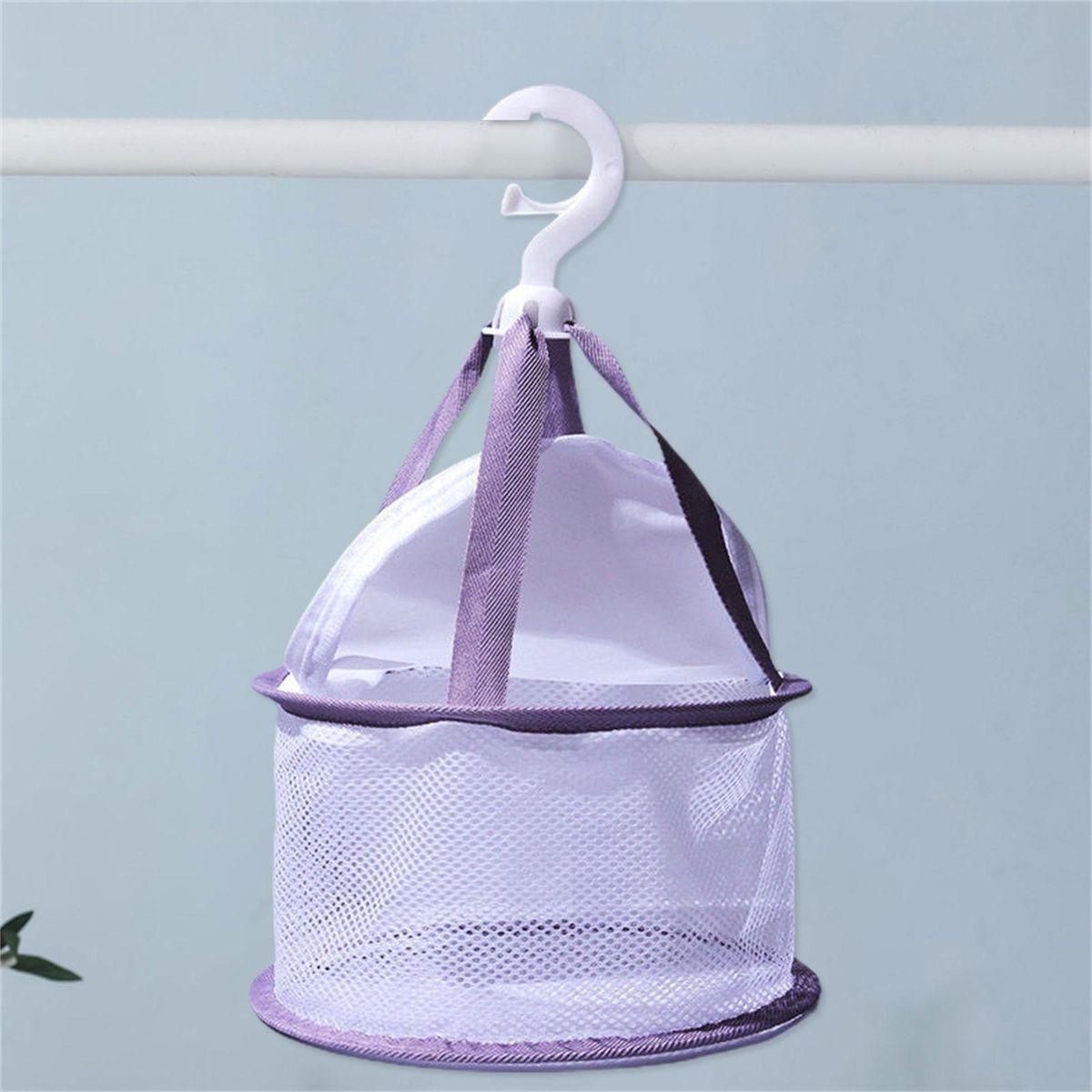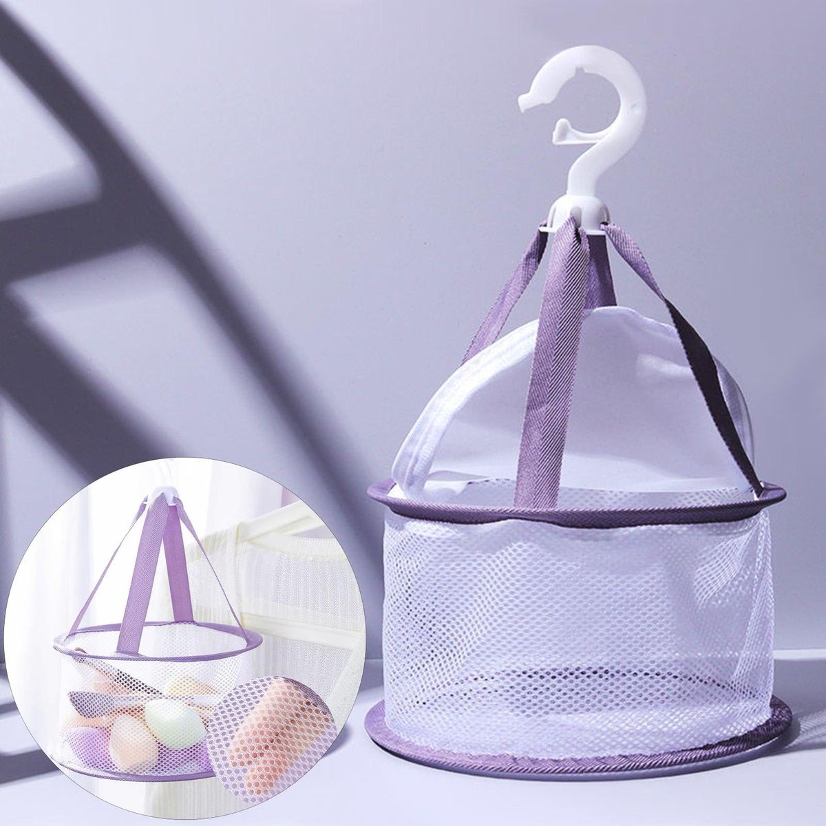 Because this drying basket is equipped with hanging hook and windproof buckle, which is convenient for you to hanging on balcony or bathroom to drying clothes.