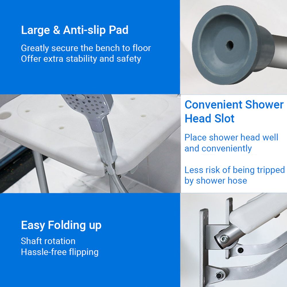 features comfortable seat, anti-slip feet, convenient shower head slots, fits the elderly, disabled, individuals with limited mobility or having trouble in standing, helps them sit and shower safely while in the shower, creates a safe and pleasant bath experience. When the shower bench is not needed, it can be folded to save space, suitable to use in your bathroom.