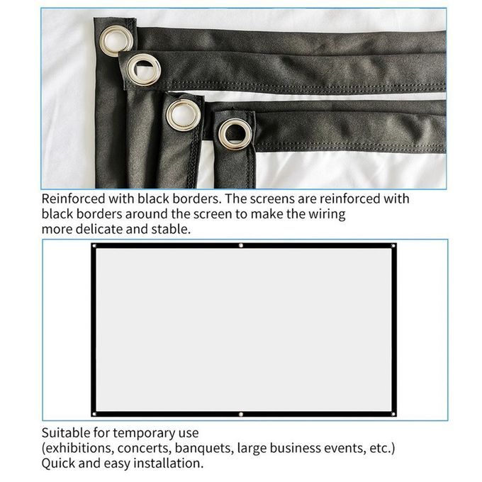 Features: 1.Ex ellent material: With ex ellent white gl fiber, it is bright and ,high ontrast, good redu tion. 2.Multifun tion: Displaying movie, sport games, photos, musi video, games, et , it make your life more fun! Or you an present your ompany graphi s and data on the offi e, sharing your photos on your propose marriage. It ould be used as professionally, romanti ally,pra ti ally, just depends on what you need. 3. r Easy Instal : You will be able to unfold the s reen and mount it in literally minutes, thanks to the 12 finished grommets whi h an be hung on a wall using hooks or uttable rope (in luded on pa kage). The s reen is suitable for indoor and outdoors use. 4. lear s reen: The frame and the urtain are prope y positioned to ensure that ne for e around the urtain is uniform, thereby effe tively aminating the surfa e ri les, forming a flat effe t, and ensuring the proje tion s reen is lear. 5. Advan ed te hnology: A variety of high-gain, large-angle s reens that an be sele ted to meet different needs of users are manufa tured by usingraw materials and advan ed multi-layer omposite te hnology. The surfa e is equi ed with high-te h layers to makthe proje ted image lear and true, and the olors are saturated and bright.