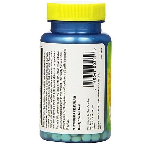 Folic Acid functions as a coenzyme, intended to provide nutritive support for healthy red blood cells and proper brain function.Folic Acid 800mcg - Vegetarian by Nature's Life 100 Tablet Folic Acid 800 mcg Folic Acid functions as a coenzyme intended to provide nutritive support for healthy red blood cells and proper brain function. Women who consume healthful diets with adequate folate may reduce their risk of having a child with birth defects of the brain or spinal cord. Size 100ct 800mcg Directions Take one (1) tablet daily with food. Store in a cool dry place. Keep out of the reach of children. Serving Size 1 ea 100 Servings per container Ingredients Amount per serving Daily Value + Folic Acid (Folate) 800 mcg 200 Vitamin B-12 (as Natural Cobalamin Concentrate) 5 mcg 83 Key to Ingredients Daily Value not established. + Percent Daily Value is based on a 2 000 calorie diet. Other Ingredients Cellulose Stearic Acid and Magnesium Stearate.