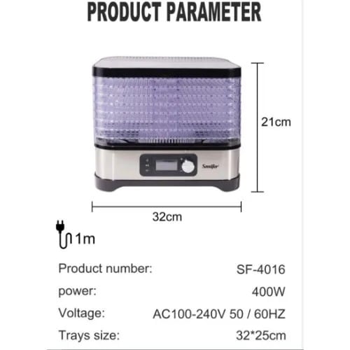 food dehydrator makes life easyfast easy way to make delicious, healthful and natural snacks like banana chips, fruit roll- up and beef jerky.5 detachtable trayspatented converge flow drying system eliminates tray rotation .adjustable thermostat lets different foods dry at the proper temperature.thermostat range of 35- 70 celciusopaque- vita save exterior helps block light , which can destroy the nutrient content of food.power- 350wvoltage 50/60hzfrequency- 20/ 240v