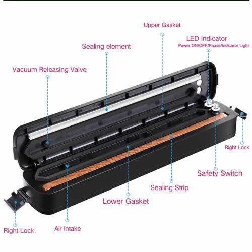 Features:Economical and Practical:Vacuum Food Sealer eliminates freezer burn, reduces spoilage and food waste, and effectively increases food shelf life, making food still fresh and flavorful.Good Healper for Cooking:Cooking and meal preparation becomes easier. Using Sous-Vide cooking method to acheive excellent results when preparing food. It also saves space of your freezer with the airtight bag packaging.Easy to Operate:Do vacuum packing and sealing with one simple press, sealing food in seconds, offering you a quick, easy and inexpensive way of preserving your food.Compact & Slim Design:Compact size and lightweight design for easy store. It can be placed on any kitchen counter top. Be careful with the heated sealing edge, not recommended for children to use.Requirements on Film / Bags:The Vacuum Sealer fits up to 27cm width vacuum sealer bags and rolls with dots, knobs or grooves on one side and can preserve all types of food.Note:1. When placing the bag in the vacuum sealer, the end of the film must be positioned in front of the rear limitation webs and the lateral limitation webs (just inside the bottom sealing ring).2. Please keep children and animals away from the electric device at all time.3. The welding wire becomes very hot during operation. Do not touch it.Specifications:Two Modes: Seal Only, Vacuum & SealSealing Width: 27cmVacuum Degree: -60KpaRated Voltage Power Supply: AC 100V-240V 50/60HzPower: 90WColor: BlackItem Size: 36.8 * 7.7 * 7.5cm / 14.48 * 3.03 * 2.95inItem Weight: 420g / 14.80ozPackage Size: 37.3 * 9.9 * 8.1cm / 14.68 * 3.89 * 3.18in