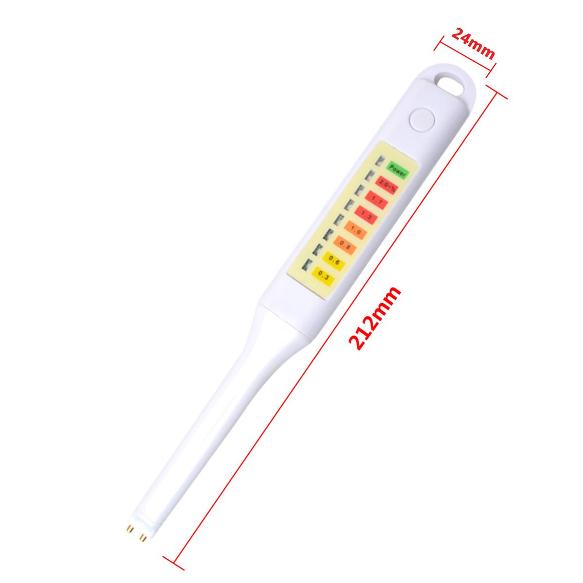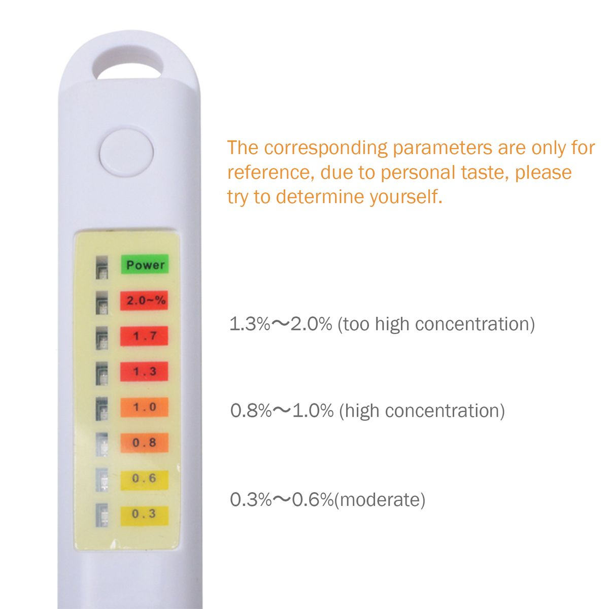 8 LED indicator lights: 0.3%~0.6%(moderate); 0.8%~1.0% (high concentration); 1.3%~2.0% (too high concentration), the corresponding parameters are only for reference, due to personal taste, please try to determine yourself. 1 green LED for power indication.