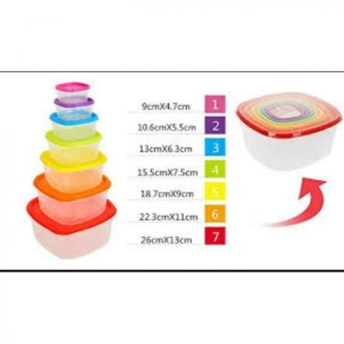 This multi-color food storage container is a collection of practical, space-saving mixing, measuring, and prep set.