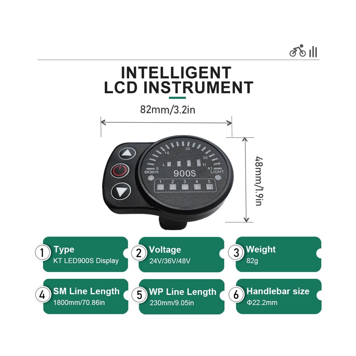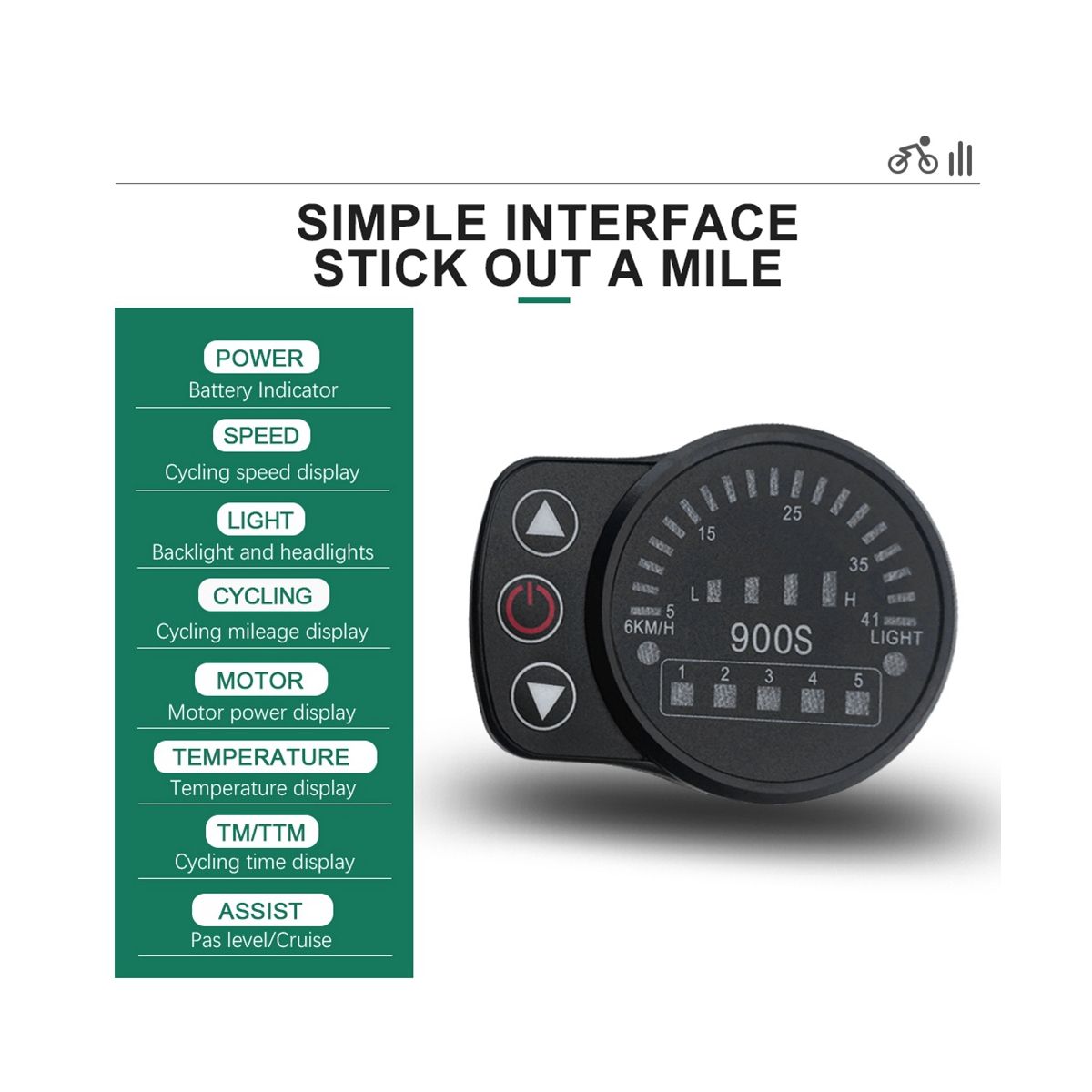 The LED900S electric bicycle display uses LED lamp beads to display information such as vehicle speed, battery power, 6KM/H assistance, and headlight switches.